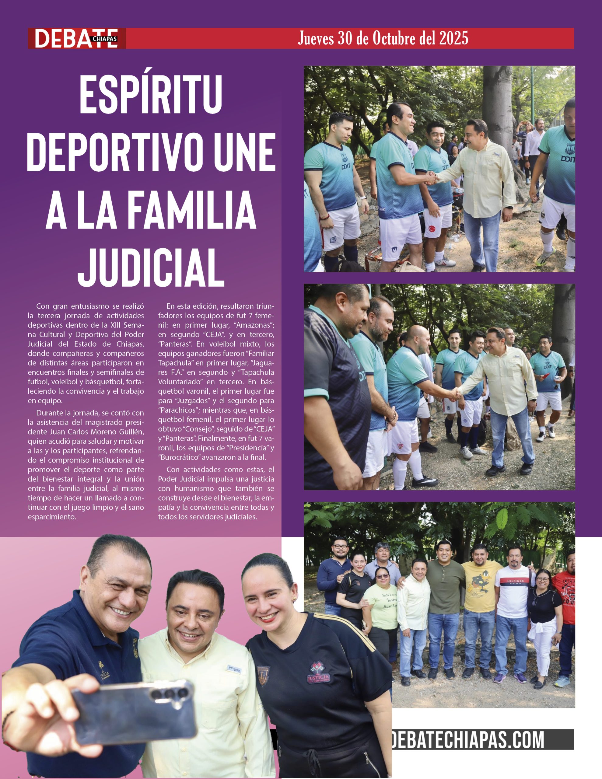 Con gran entusiasmo se realizó la tercera jornada de actividades deportivas dentro de la XIII Semana Cultural y Deportiva del Poder Judicial del Estado de Chiapas, donde compañeras y compañeros de distintas áreas participaron en encuentros finales y semifinales de futbol, voleibol y básquetbol, fortaleciendo la convivencia y el trabajo en equipo.
