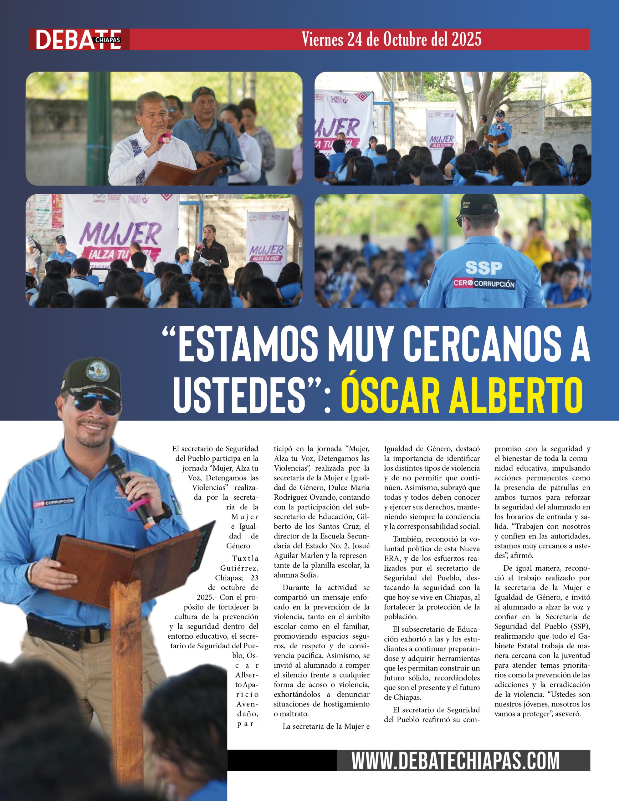 Tuxtla Gutiérrez, Chiapas; 23 de octubre de 2025.- Con el propósito de fortalecer la cultura de la prevención y la seguridad dentro del entorno educativo, el secretario de Seguridad del Pueblo, Óscar Alberto Aparicio Avendaño, participó en la jornada “Mujer, Alza tu Voz, Detengamos las Violencias”, realizada por la secretaria de la Mujer e Igualdad de Género, Dulce María Rodríguez Ovando, contando con la participación del subsecretario de Educación, Gilberto de los Santos Cruz; el director de la Escuela Secundaria del Estado No. 2, Josué Aguilar Marlen y la representante de la planilla escolar, la alumna Sofía.