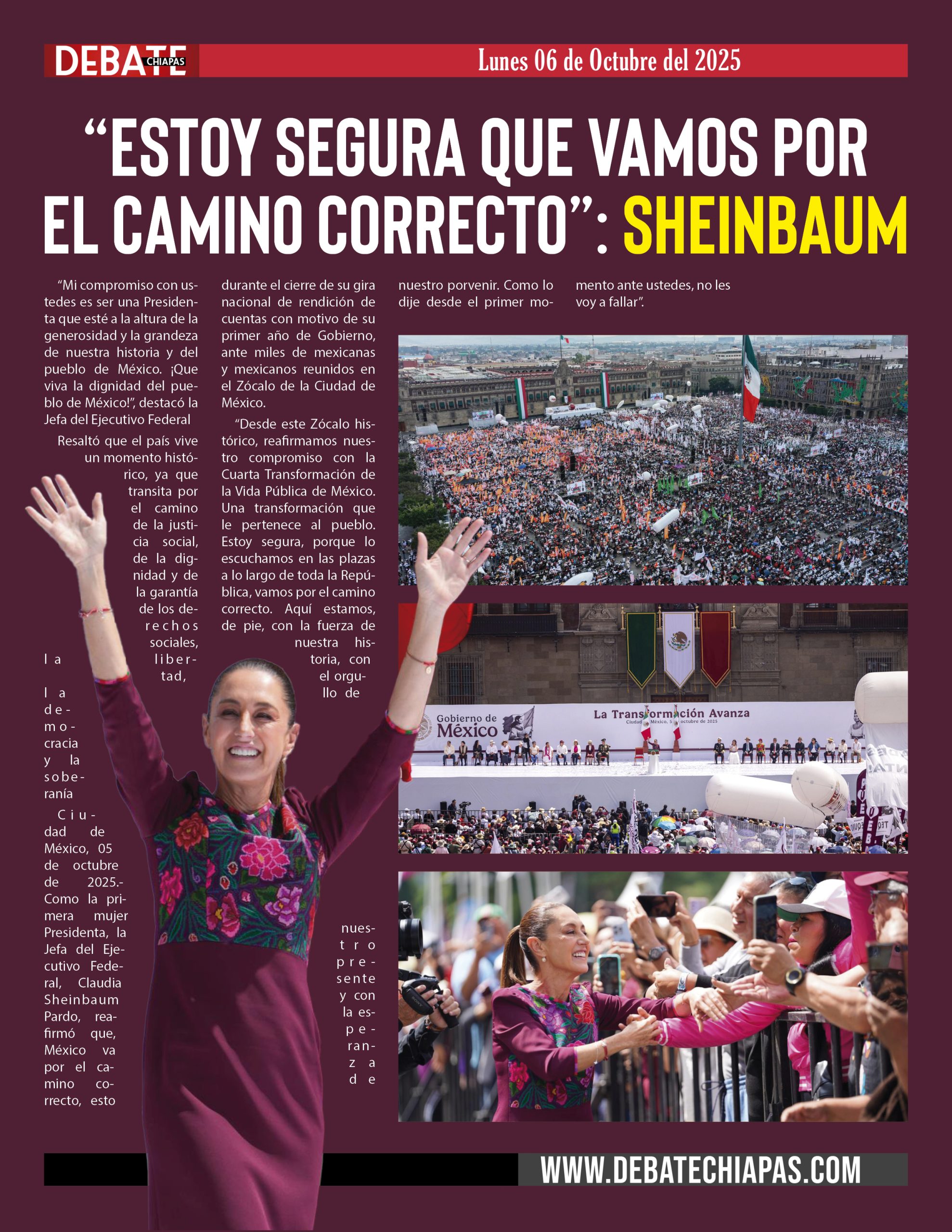Ciudad de México, 05 de octubre de 2025.- Como la primera mujer Presidenta, la Jefa del Ejecutivo Federal, Claudia Sheinbaum Pardo, reafirmó que, México va por el camino correcto, esto durante el cierre de su gira nacional de rendición de cuentas con motivo de su primer año de Gobierno, ante miles de mexicanas y mexicanos reunidos en el Zócalo de la Ciudad de México.