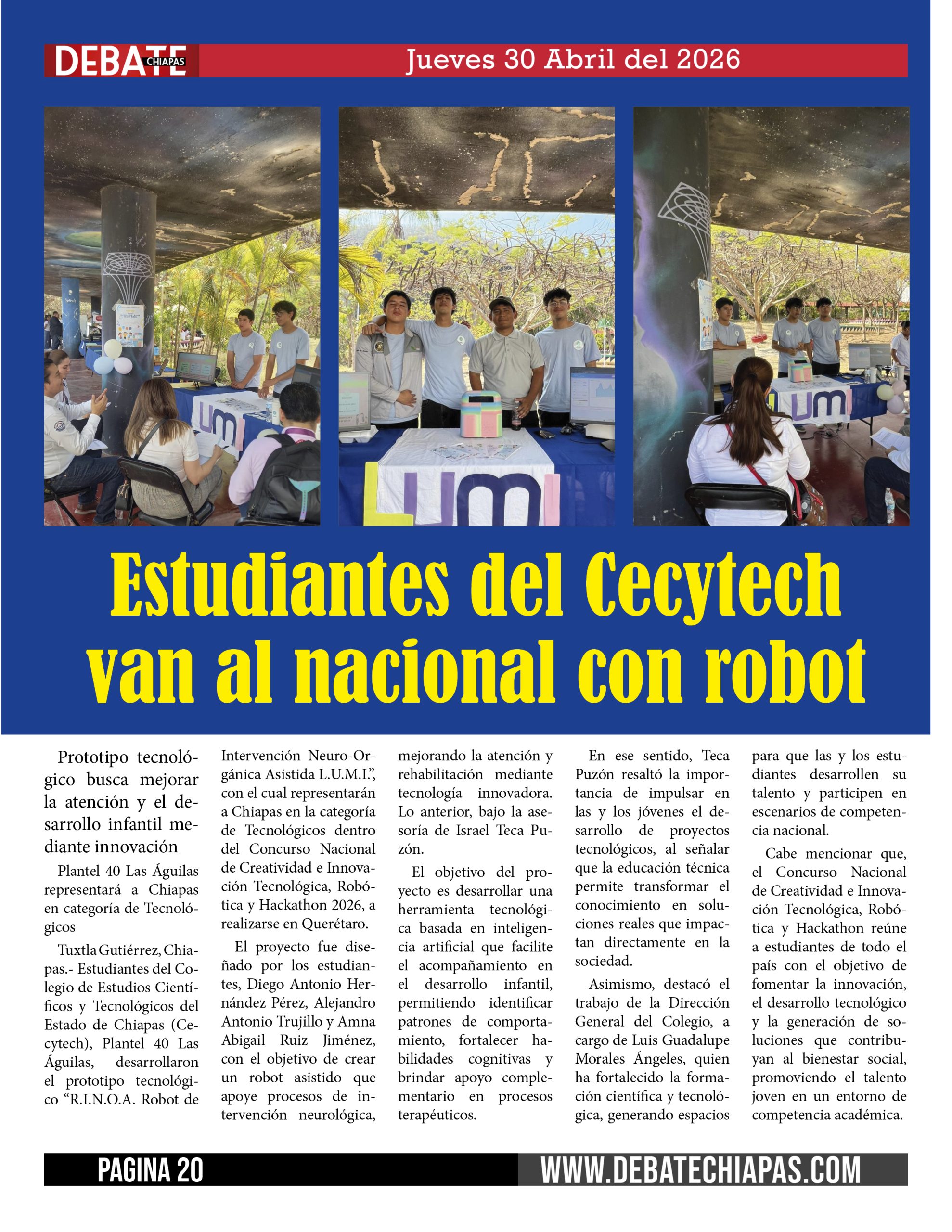 Tuxtla Gutiérrez, Chiapas.- Estudiantes del Colegio de Estudios Científicos y Tecnológicos del Estado de Chiapas (Cecytech), Plantel 40 Las Águilas, desarrollaron el prototipo tecnológico “R.I.N.O.A. Robot de Intervención Neuro-Orgánica Asistida L.U.M.I.”, con el cual representarán a Chiapas en la categoría de Tecnológicos dentro del Concurso Nacional de Creatividad e Innovación Tecnológica, Robótica y Hackathon 2026, a realizarse en Querétaro.