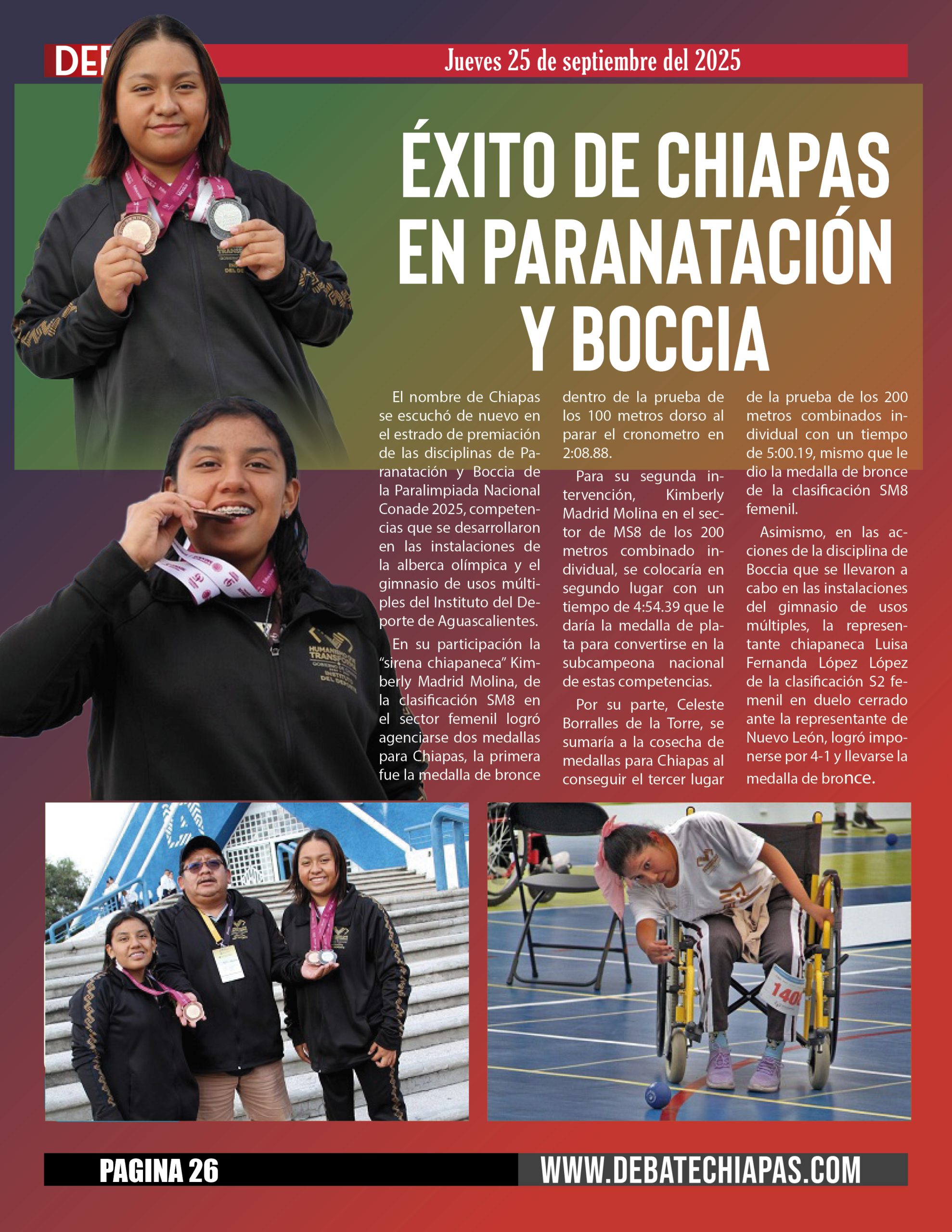 El nombre de Chiapas se escuchó de nuevo en el estrado de premiación de las disciplinas de Paranatación y Boccia de la Paralimpiada Nacional Conade 2025, competencias que se desarrollaron en las instalaciones de la alberca olímpica y el gimnasio de usos múltiples del Instituto del Deporte de Aguascalientes.
