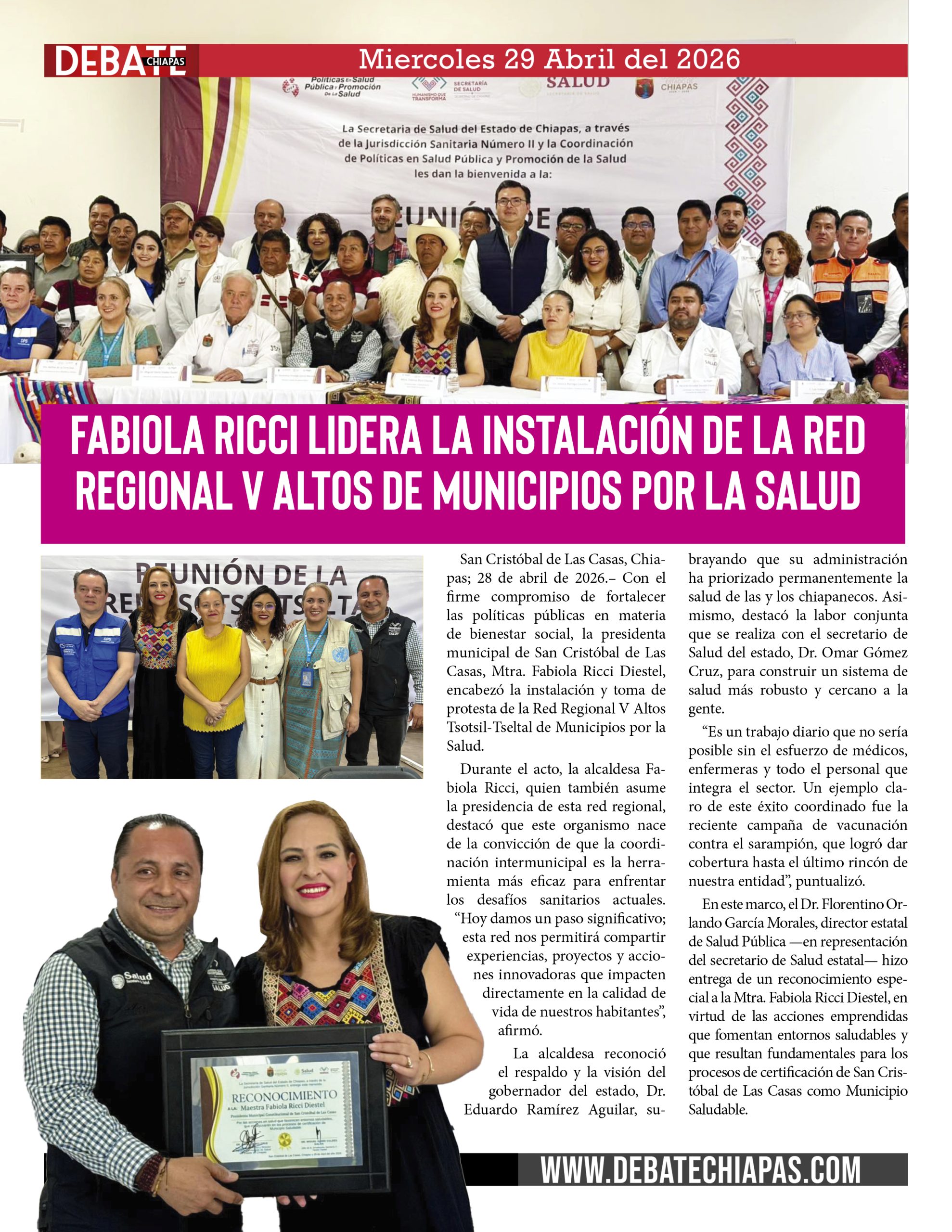 San Cristóbal de Las Casas, Chiapas; 28 de abril de 2026.– Con el firme compromiso de fortalecer las políticas públicas en materia de bienestar social, la presidenta municipal de San Cristóbal de Las Casas, Mtra. Fabiola Ricci Diestel, encabezó la instalación y toma de protesta de la Red Regional V Altos Tsotsil-Tseltal de Municipios por la Salud.