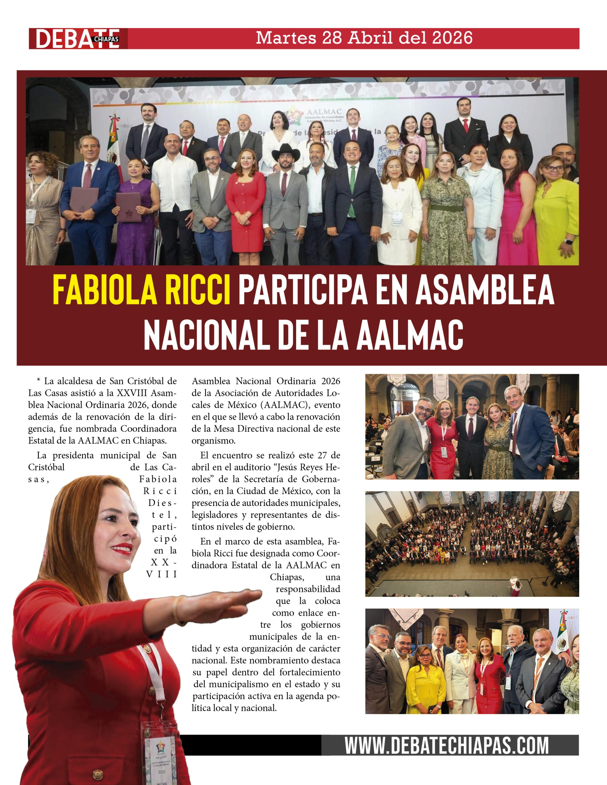 La presidenta municipal de San Cristóbal de Las Casas, Fabiola Ricci Diestel, participó en la XXVIII Asamblea Nacional Ordinaria 2026 de la Asociación de Autoridades Locales de México (AALMAC), evento en el que se llevó a cabo la renovación de la Mesa Directiva nacional de este organismo.