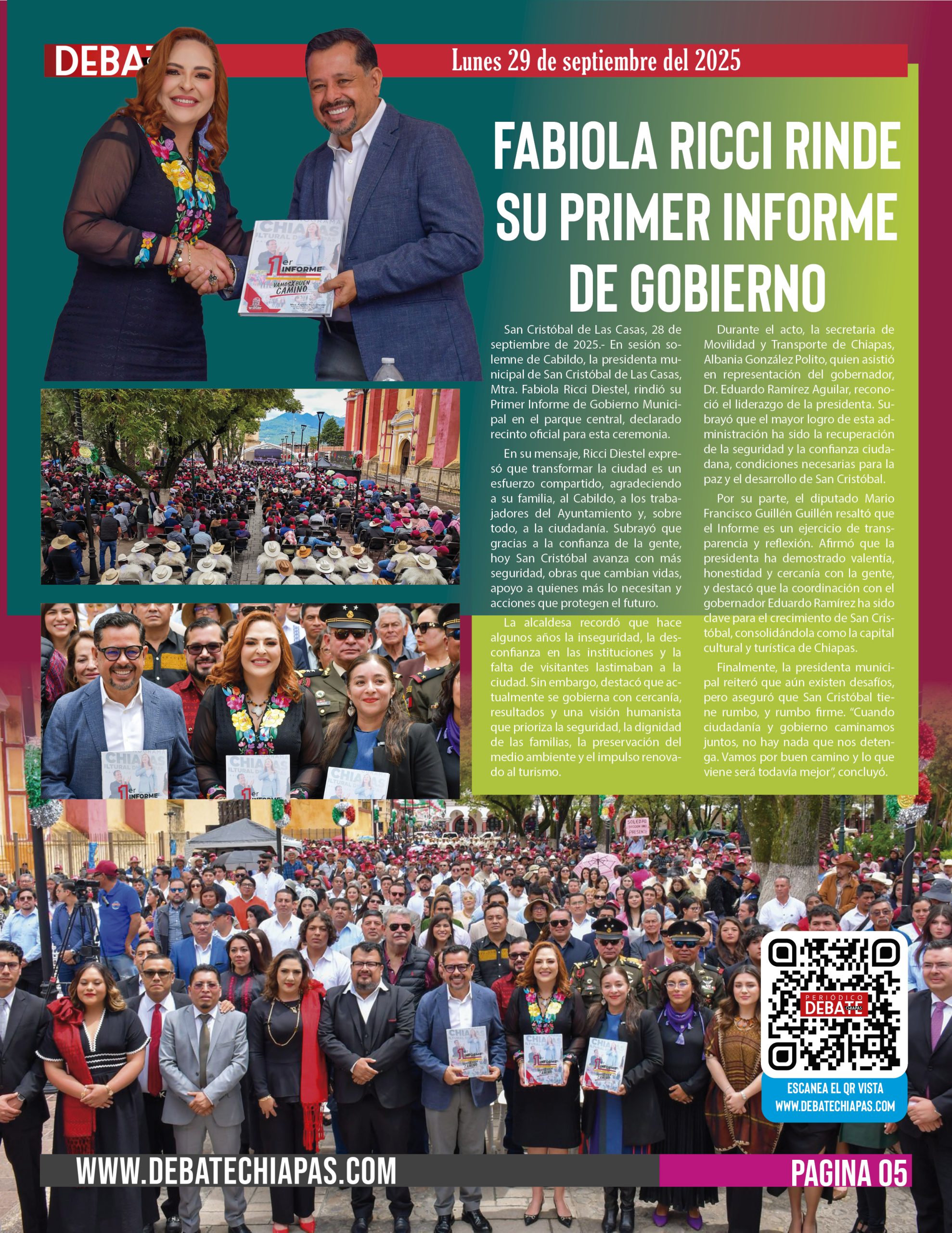 San Cristóbal de Las Casas, 28 de septiembre de 2025.- En sesión solemne de Cabildo, la presidenta municipal de San Cristóbal de Las Casas, Mtra. Fabiola Ricci Diestel, rindió su Primer Informe de Gobierno Municipal en el parque central, declarado recinto oficial para esta ceremonia.