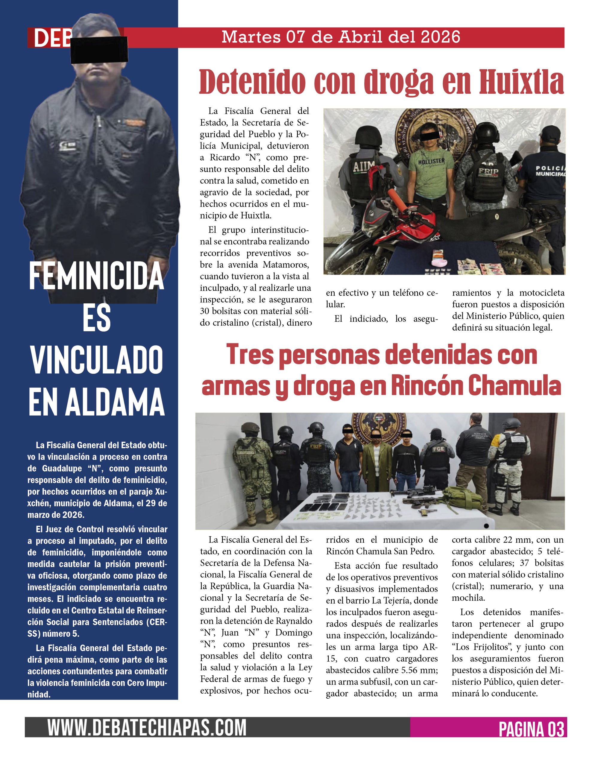 La Fiscalía General del Estado obtuvo la vinculación a proceso en contra de Guadalupe “N”, como presunto responsable del delito de feminicidio, por hechos ocurridos en el paraje Xuxchén, municipio de Aldama, el 29 de marzo de 2026.