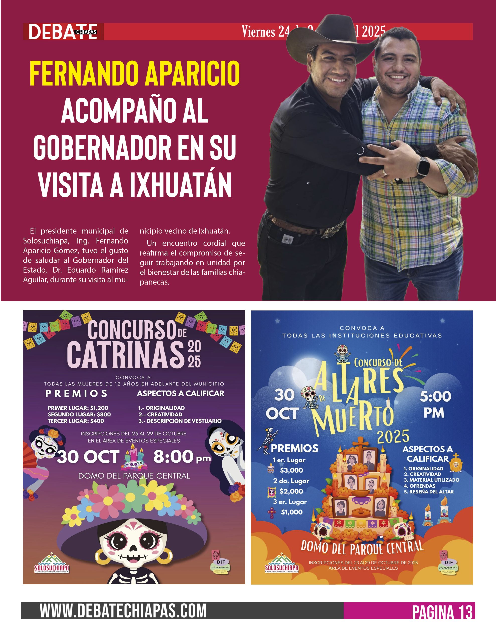 El presidente municipal de Solosuchiapa, Ing. Fernando Aparicio Gómez, tuvo el gusto de saludar al Gobernador del Estado, Dr. Eduardo Ramírez Aguilar, durante su visita al municipio vecino de Ixhuatán.