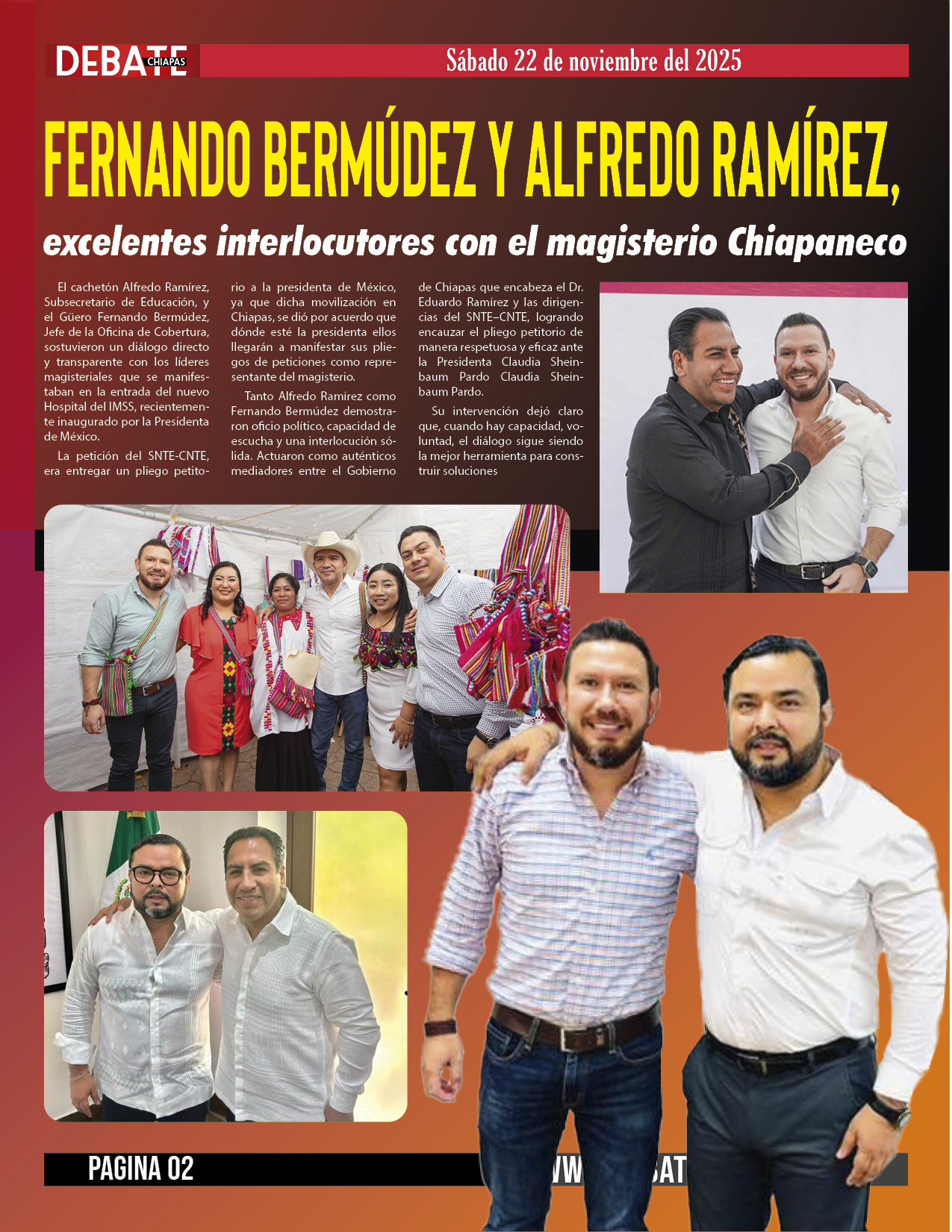 Tanto Alfredo Ramírez como Fernando Bermúdez demostraron oficio político, capacidad de escucha y una interlocución sólida. Actuaron como auténticos mediadores entre el Gobierno de Chiapas que encabeza el Dr. Eduardo Ramírez y las dirigencias del SNTE–CNTE, logrando encauzar el pliego petitorio de manera respetuosa y eficaz ante la Presidenta Claudia Sheinbaum Pardo Claudia Sheinbaum Pardo.