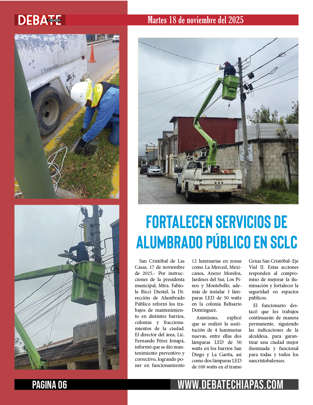 San Cristóbal de Las Casas, 17 de noviembre de 2025.- Por instrucciones de la presidenta municipal, Mtra. Fabiola Ricci Diestel, la Dirección de Alumbrado Público reforzó los trabajos de mantenimiento en distintos barrios, colonias y fraccionamientos de la ciudad. El director del área, Lic. Fernando Pérez Jonapá, informó que se dio mantenimiento preventivo y correctivo, logrando poner en funcionamiento 12 luminarias en zonas como La Merced, Mexicanos, Anexo Morelos, Jardines del Sur, Los Pinos y Montebello, además de instalar 3 lámparas LED de 50 watts en la colonia Belisario Domínguez.