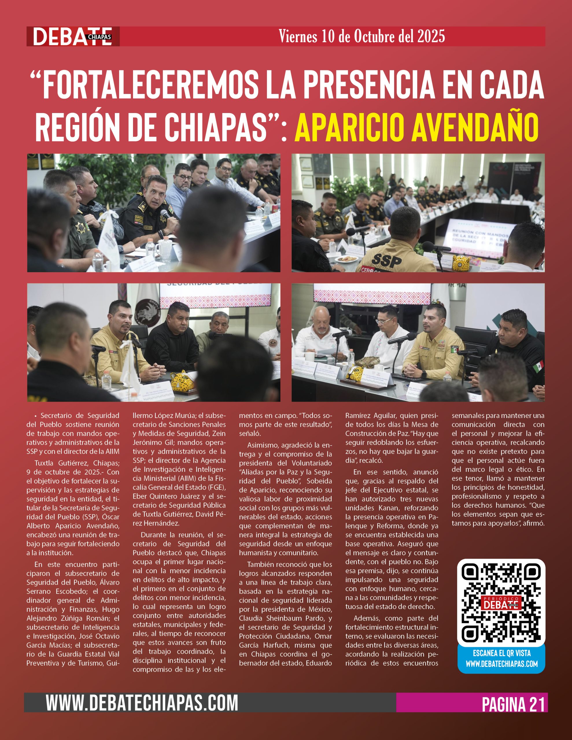 Tuxtla Gutiérrez, Chiapas; 9 de octubre de 2025.- Con el objetivo de fortalecer la supervisión y las estrategias de seguridad en la entidad, el titular de la Secretaría de Seguridad del Pueblo (SSP), Óscar Alberto Aparicio Avendaño, encabezó una reunión de trabajo para seguir fortaleciendo a la institución.