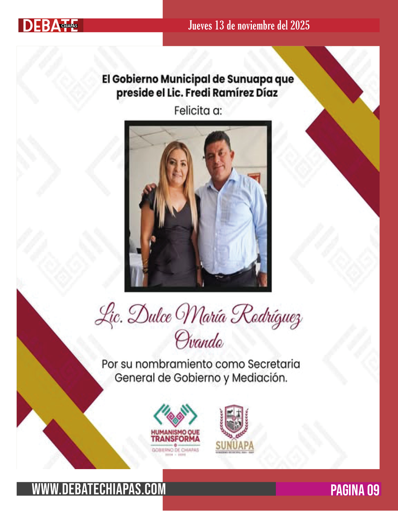 El Gobierno Municipal Sunuapa 2024 – 2027 que preside el Lic. Fredi Ramirez Diaz, extiende una cordial felicitación a la Lic. Dulce María Rodriguez Ovando por su reciente nombramiento como Titular de la Secretaría General de Gobierno y Mediación del Gobierno del Estado de Chiapas.