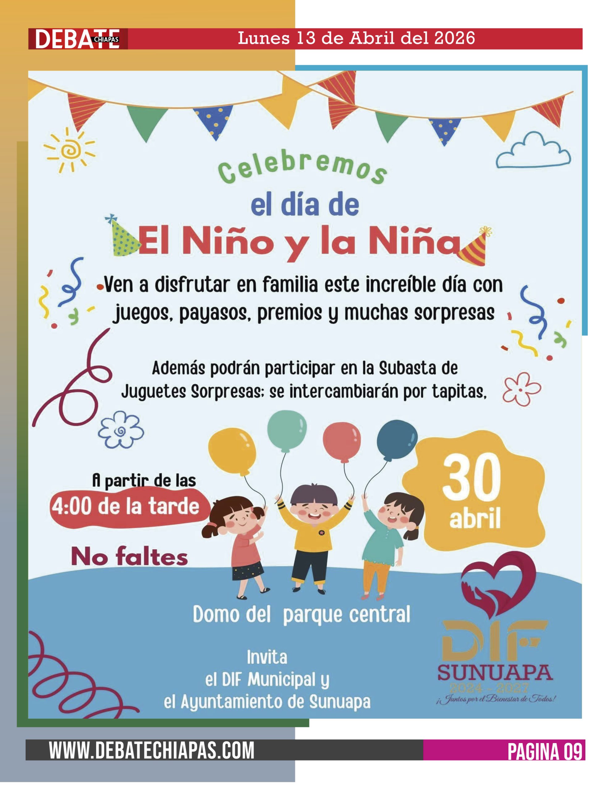 El DIF Municipal de Sunuapa en coordinación con el Ayuntamiento te invita a disfrutar de una tarde llena de alegría, juegos, payasos, premios y muchas sorpresas para toda la familia. 💖