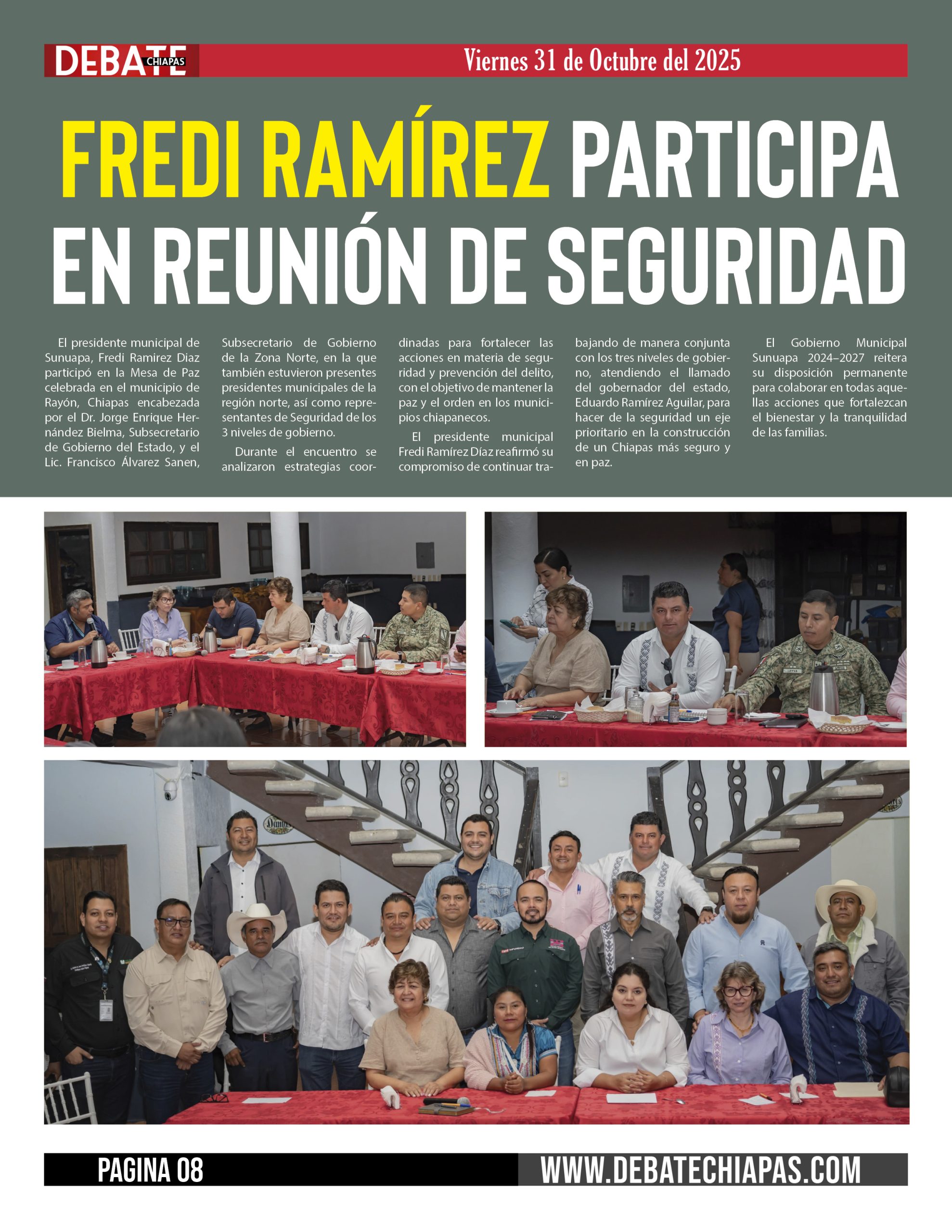 El presidente municipal de Sunuapa, Fredi Ramirez Diaz participó en la Mesa de Paz celebrada en el municipio de Rayón, Chiapas encabezada por el Dr. Jorge Enrique Hernández Bielma, Subsecretario de Gobierno del Estado, y el Lic. Francisco Álvarez Sanen, Subsecretario de Gobierno de la Zona Norte, en la que también estuvieron presentes presidentes municipales de la región norte, así como representantes de Seguridad de los 3 niveles de gobierno.