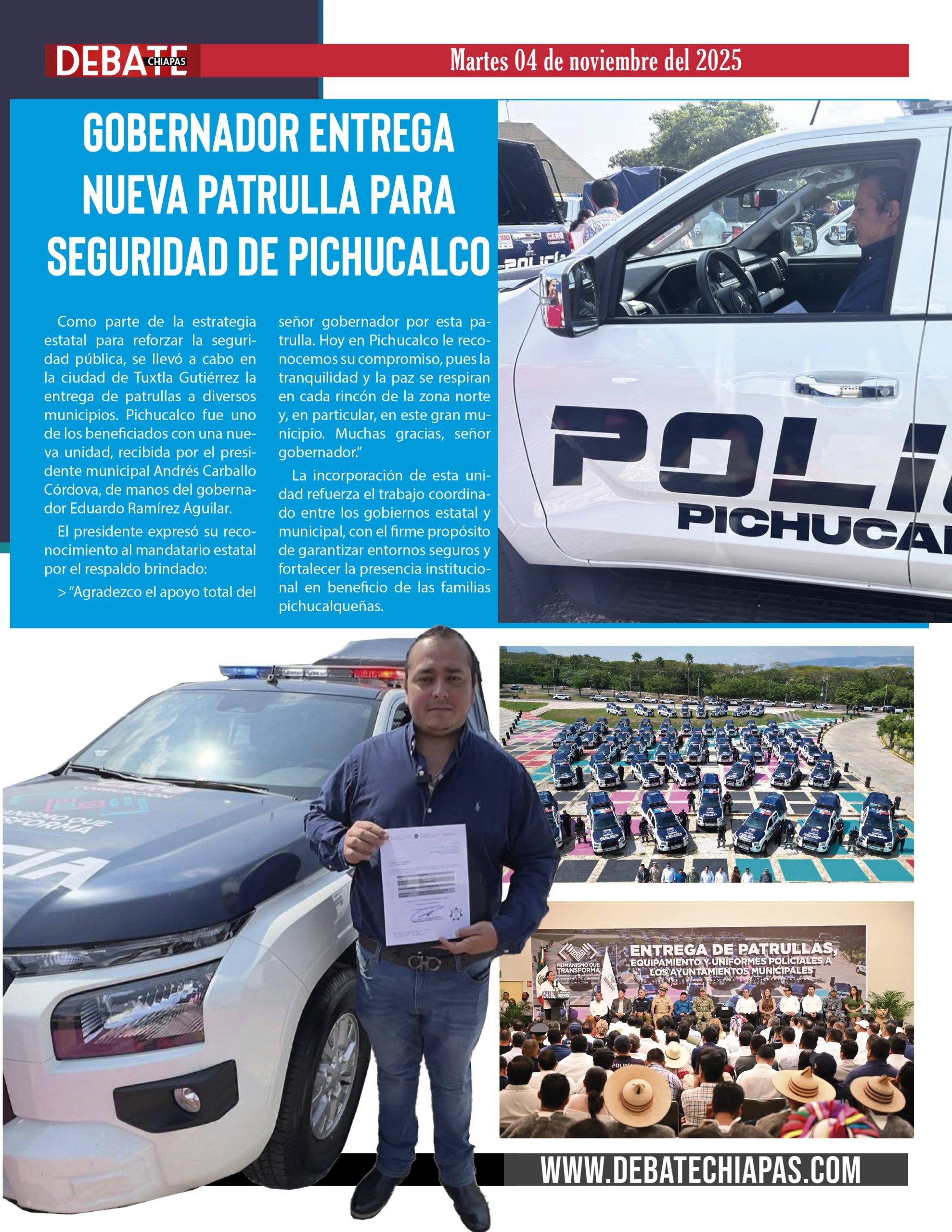 Como parte de la estrategia estatal para reforzar la seguridad pública, se llevó a cabo en la ciudad de Tuxtla Gutiérrez la entrega de patrullas a diversos municipios. Pichucalco fue uno de los beneficiados con una nueva unidad, recibida por el presidente municipal Andrés Carballo Córdova, de manos del gobernador Eduardo Ramírez Aguilar.