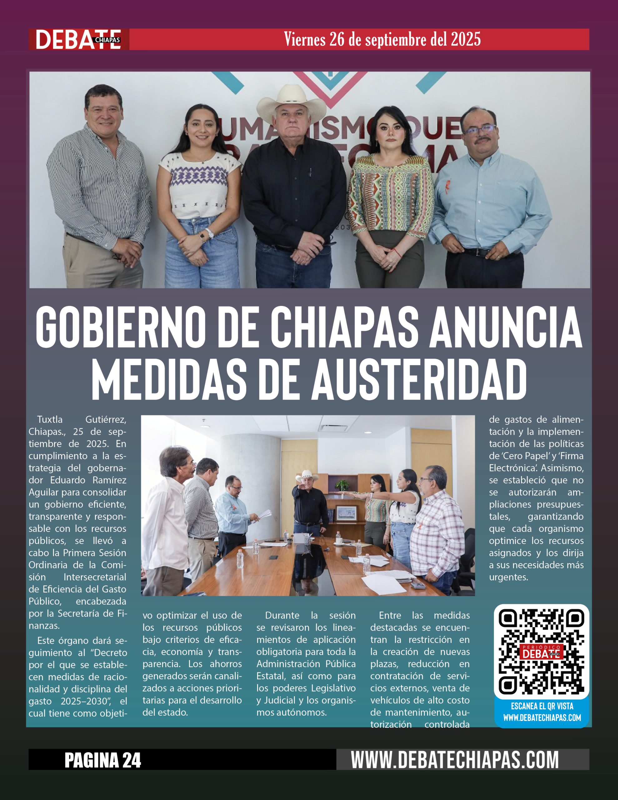 Con este primer paso, el Gobierno del Estado reafirma su compromiso con un manejo responsable, transparente y eficiente del gasto público, asegurando que cada peso se traduzca en bienestar y desarrollo para las y los chiapanecos.
