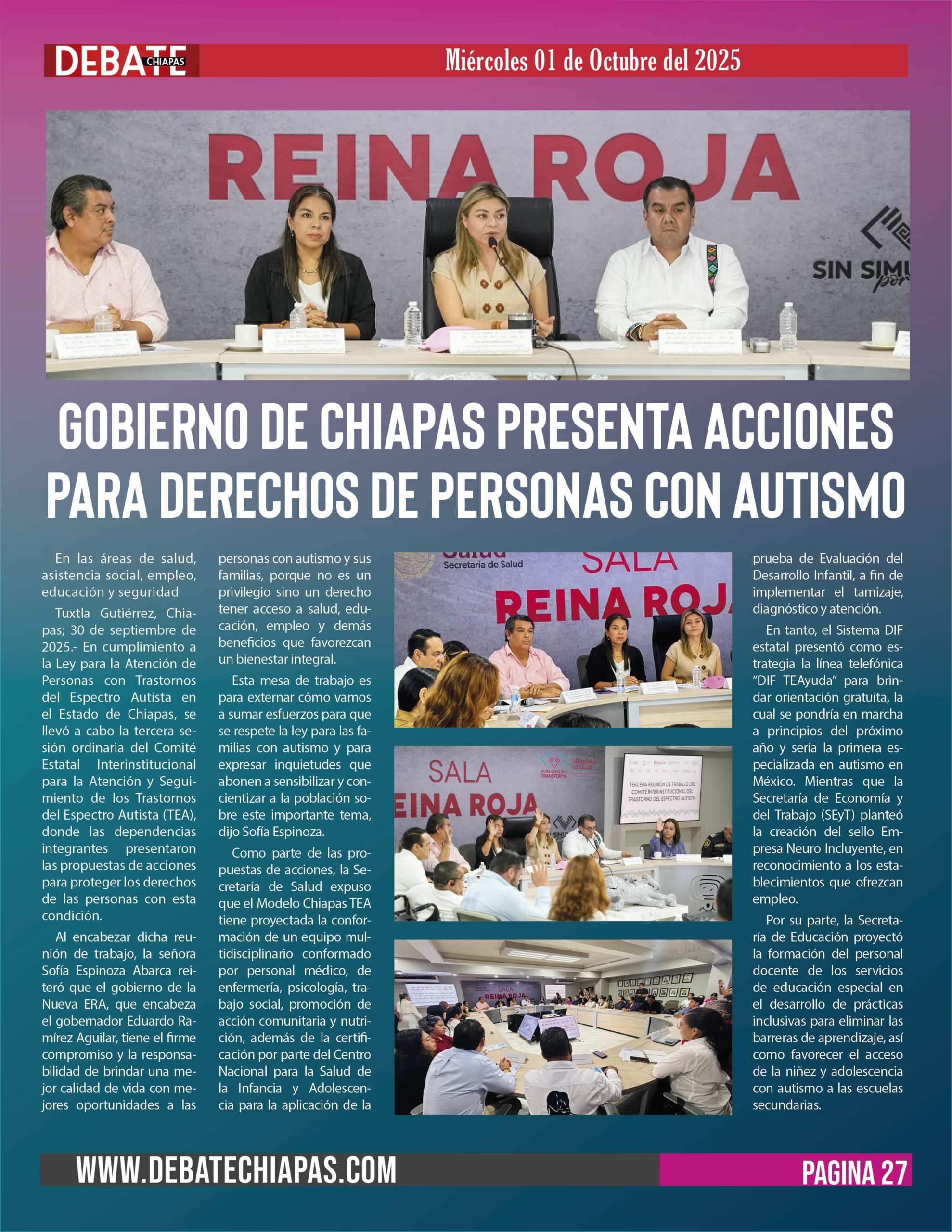 Tuxtla Gutiérrez, Chiapas; 30 de septiembre de 2025.- En cumplimiento a la Ley para la Atención de Personas con Trastornos del Espectro Autista en el Estado de Chiapas, se llevó a cabo la tercera sesión ordinaria del Comité Estatal Interinstitucional para la Atención y Seguimiento de los Trastornos del Espectro Autista (TEA), donde las dependencias integrantes presentaron las propuestas de acciones para proteger los derechos de las personas con esta condición.