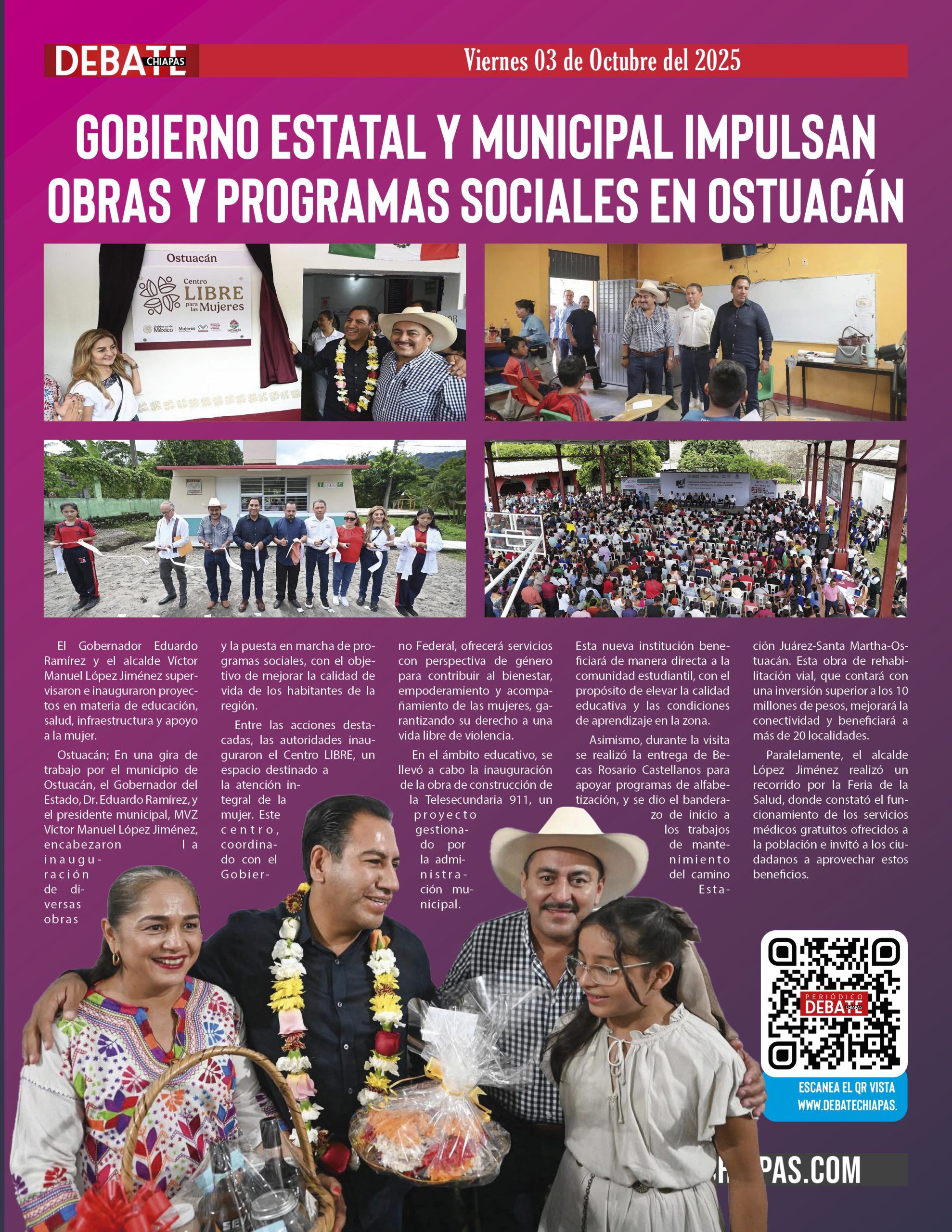 Ostuacán; En una gira de trabajo por el municipio de Ostuacán, el Gobernador del Estado, Dr. Eduardo Ramírez, y el presidente municipal, MVZ Víctor Manuel López Jiménez, encabezaron la inauguración de diversas obras y la puesta en marcha de programas sociales, con el objetivo de mejorar la calidad de vida de los habitantes de la región.