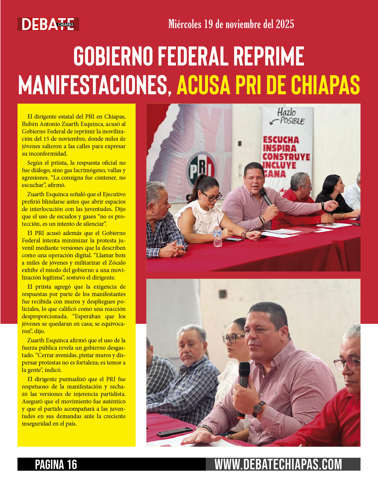 El dirigente estatal del PRI en Chiapas, Rubén Antonio Zuarth Esquinca, acusó al Gobierno Federal de reprimir la movilización del 15 de noviembre, donde miles de jóvenes salieron a las calles para expresar su inconformidad.