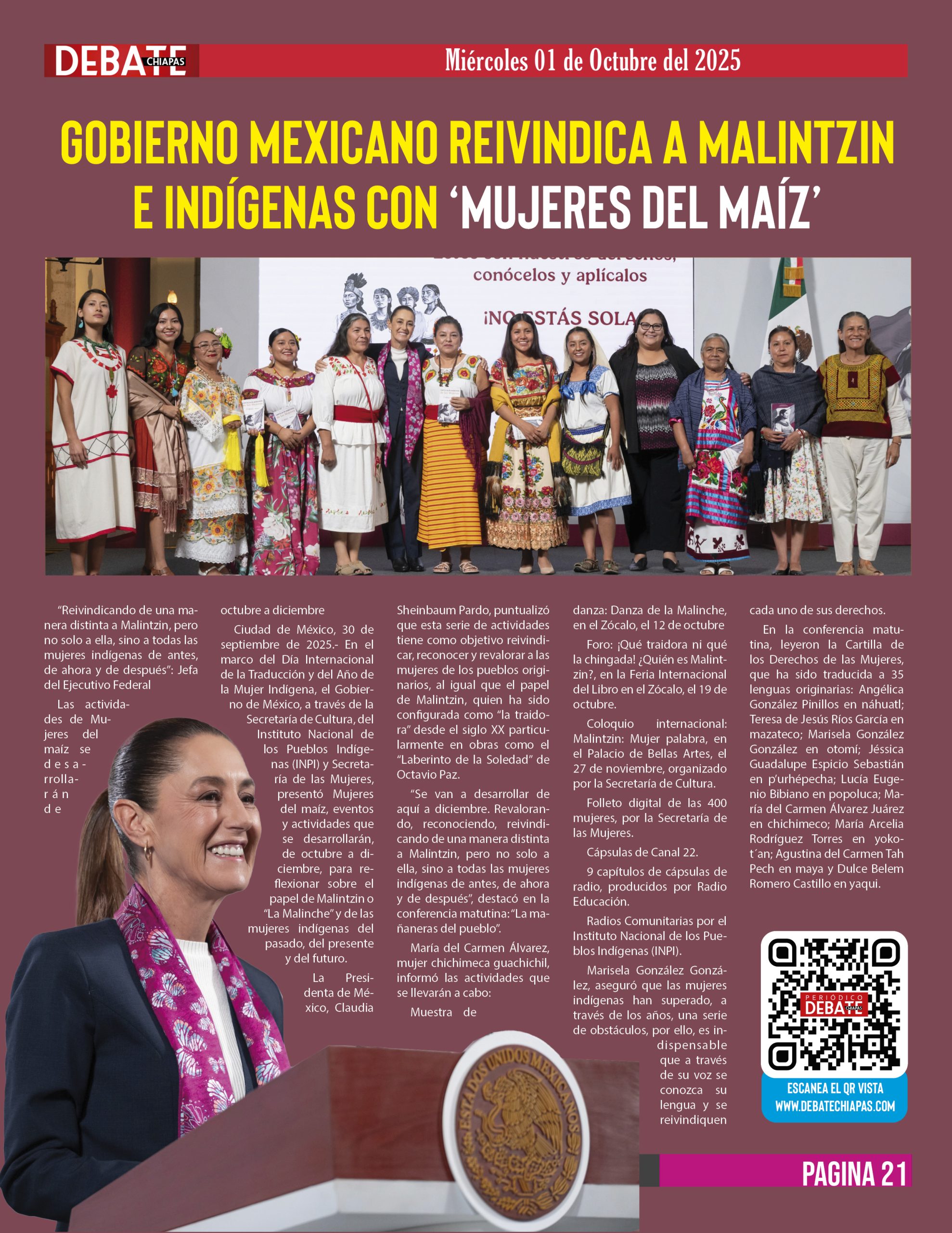 Ciudad de México, 30 de septiembre de 2025.- En el marco del Día Internacional de la Traducción y del Año de la Mujer Indígena, el Gobierno de México, a través de la Secretaría de Cultura, del Instituto Nacional de los Pueblos Indígenas (INPI) y Secretaría de las Mujeres, presentó Mujeres del maíz, eventos y actividades que se desarrollarán, de octubre a diciembre, para reflexionar sobre el papel de Malintzin o “La Malinche” y de las mujeres indígenas del pasado, del presente y del futuro.