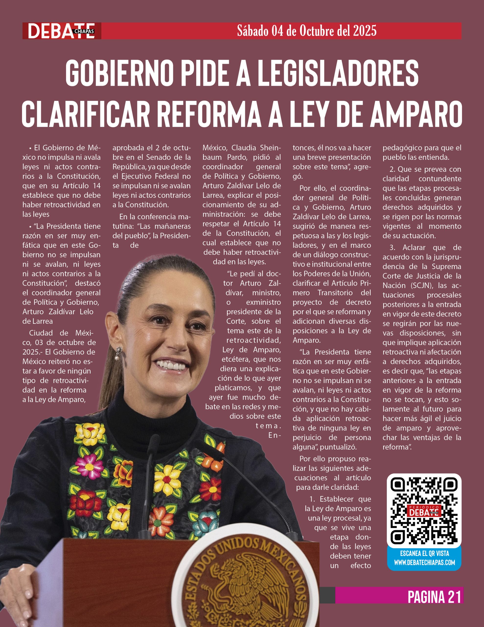Ciudad de México, 03 de octubre de 2025.- El Gobierno de México reiteró no estar a favor de ningún tipo de retroactividad en la reforma a la Ley de Amparo, aprobada el 2 de octubre en el Senado de la República, ya que desde el Ejecutivo Federal no se impulsan ni se avalan leyes ni actos contrarios a la Constitución.