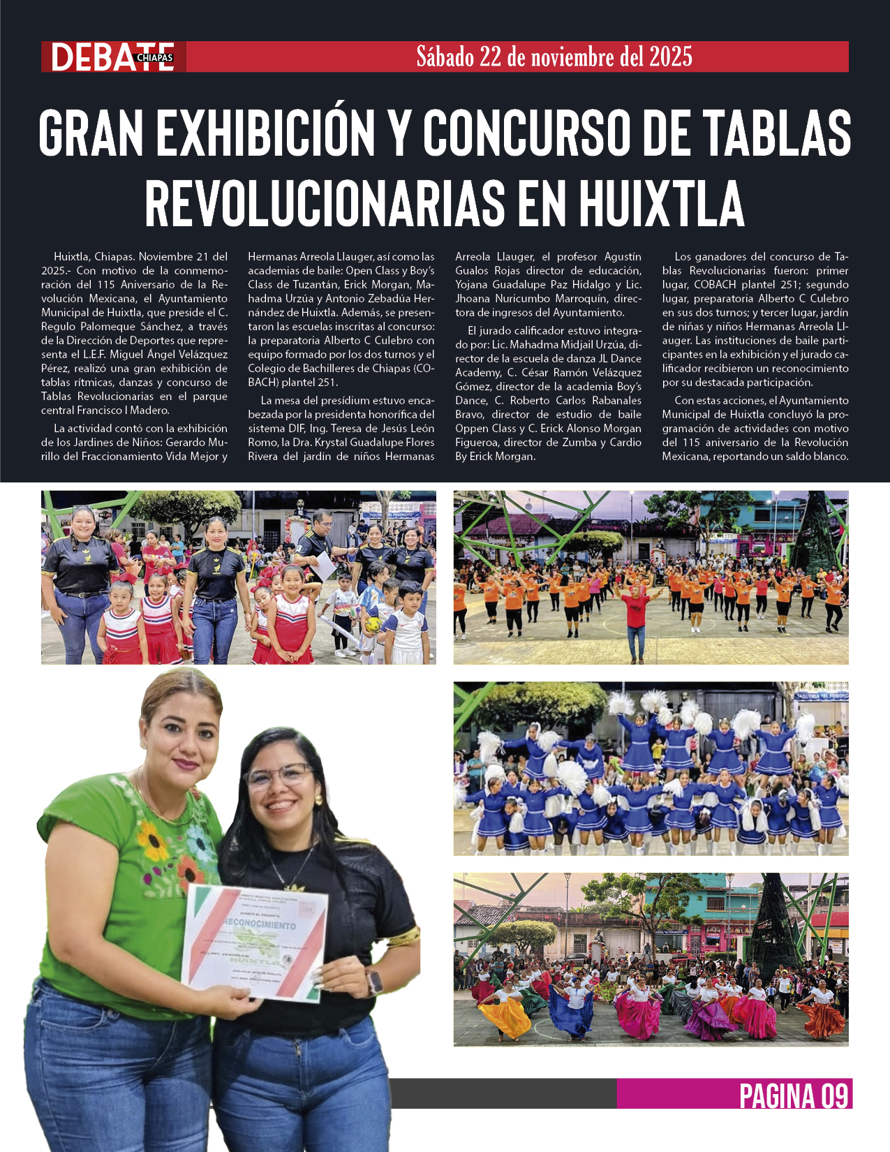 Huixtla, Chiapas. Noviembre 21 del 2025.- Con motivo de la conmemoración del 115 Aniversario de la Revolución Mexicana, el Ayuntamiento Municipal de Huixtla, que preside el C. Regulo Palomeque Sánchez, a través de la Dirección de Deportes que representa el L.E.F. Miguel Ángel Velázquez Pérez, realizó una gran exhibición de tablas rítmicas, danzas y concurso de Tablas Revolucionarias en el parque central Francisco I Madero.