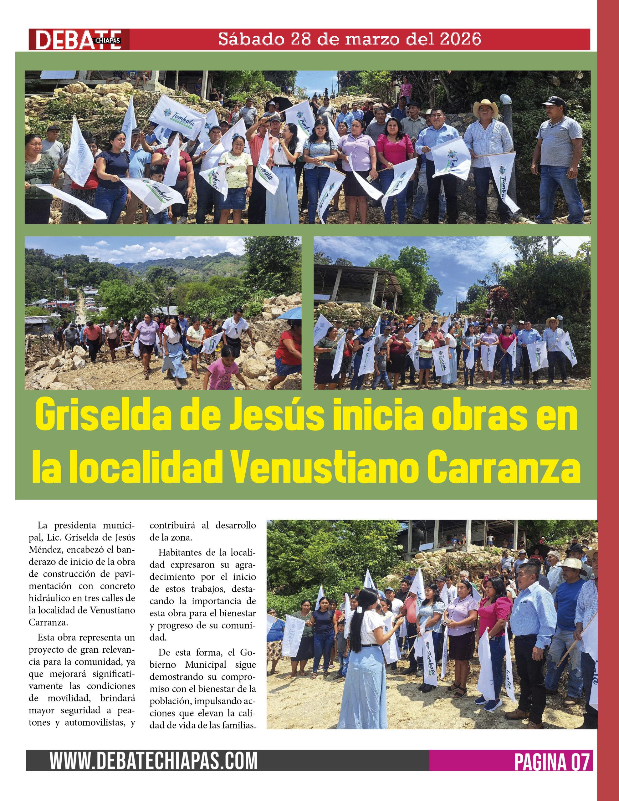 La presidenta municipal, Lic. Griselda de Jesús Méndez, encabezó el banderazo de inicio de la obra de construcción de pavimentación con concreto hidráulico en tres calles de la localidad de Venustiano Carranza.