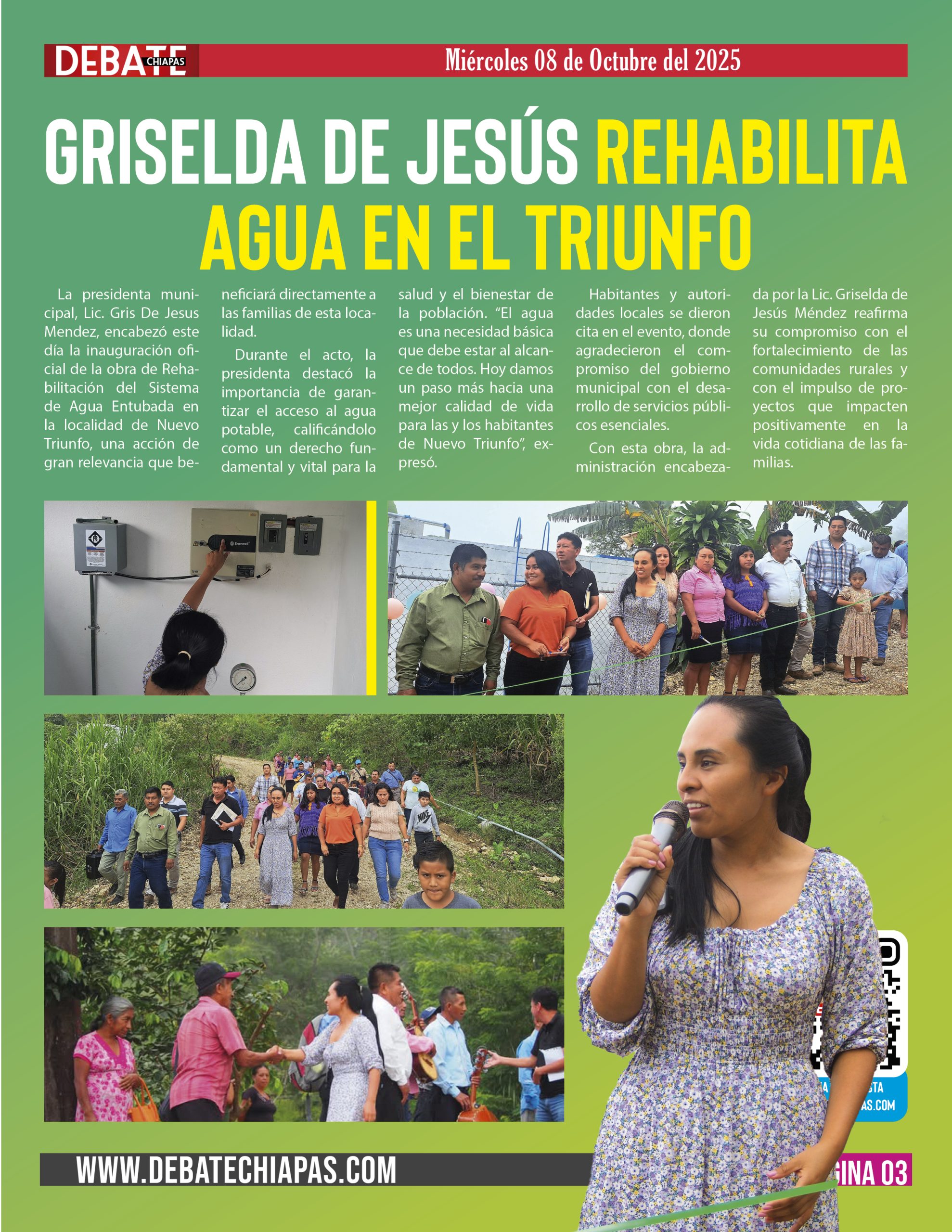 La presidenta municipal, Lic. Gris De Jesus Mendez, encabezó este día la inauguración oficial de la obra de Rehabilitación del Sistema de Agua Entubada en la localidad de Nuevo Triunfo, una acción de gran relevancia que beneficiará directamente a las familias de esta localidad.