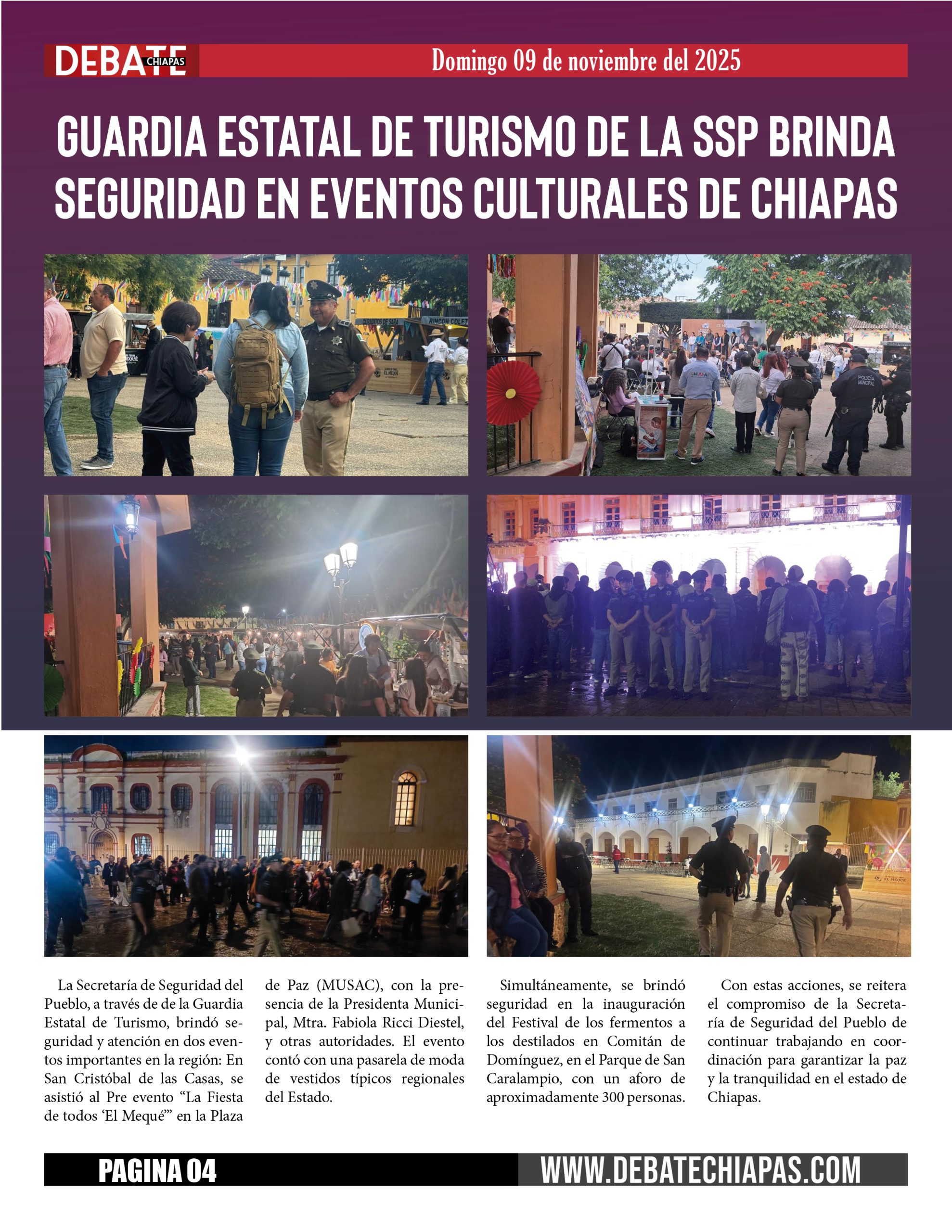 La Secretaría de Seguridad del Pueblo, a través de de la Guardia Estatal de Turismo, brindó seguridad y atención en dos eventos importantes en la región: En San Cristóbal de las Casas, se asistió al Pre evento «La Fiesta de todos ‘El Mequé'» en la Plaza de Paz (MUSAC), con la presencia de la Presidenta Municipal, Mtra. Fabiola Ricci Diestel, y otras autoridades. El evento contó con una pasarela de moda de vestidos típicos regionales del Estado.