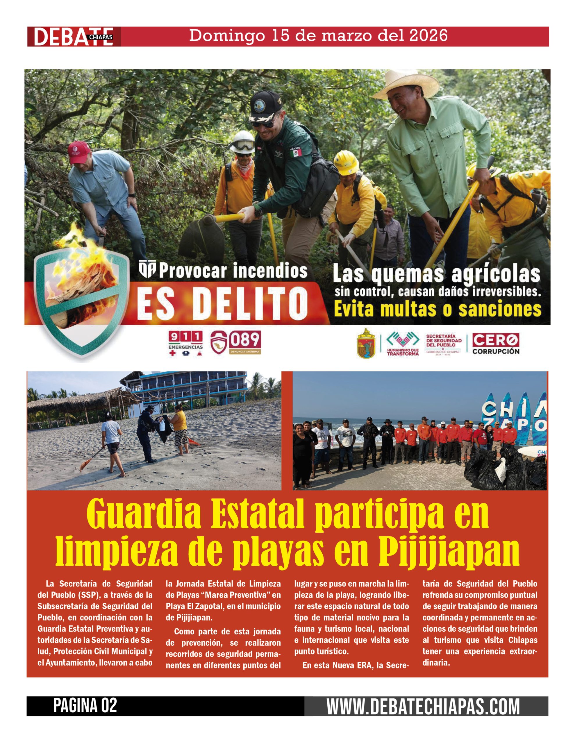 La Secretaría de Seguridad del Pueblo (SSP), a través de la Subsecretaría de Seguridad del Pueblo, en coordinación con la Guardia Estatal Preventiva y autoridades de la Secretaría de Salud, Protección Civil Municipal y el Ayuntamiento, llevaron a cabo la Jornada Estatal de Limpieza de Playas «Marea Preventiva» en Playa El Zapotal, en el municipio de Pijijiapan.