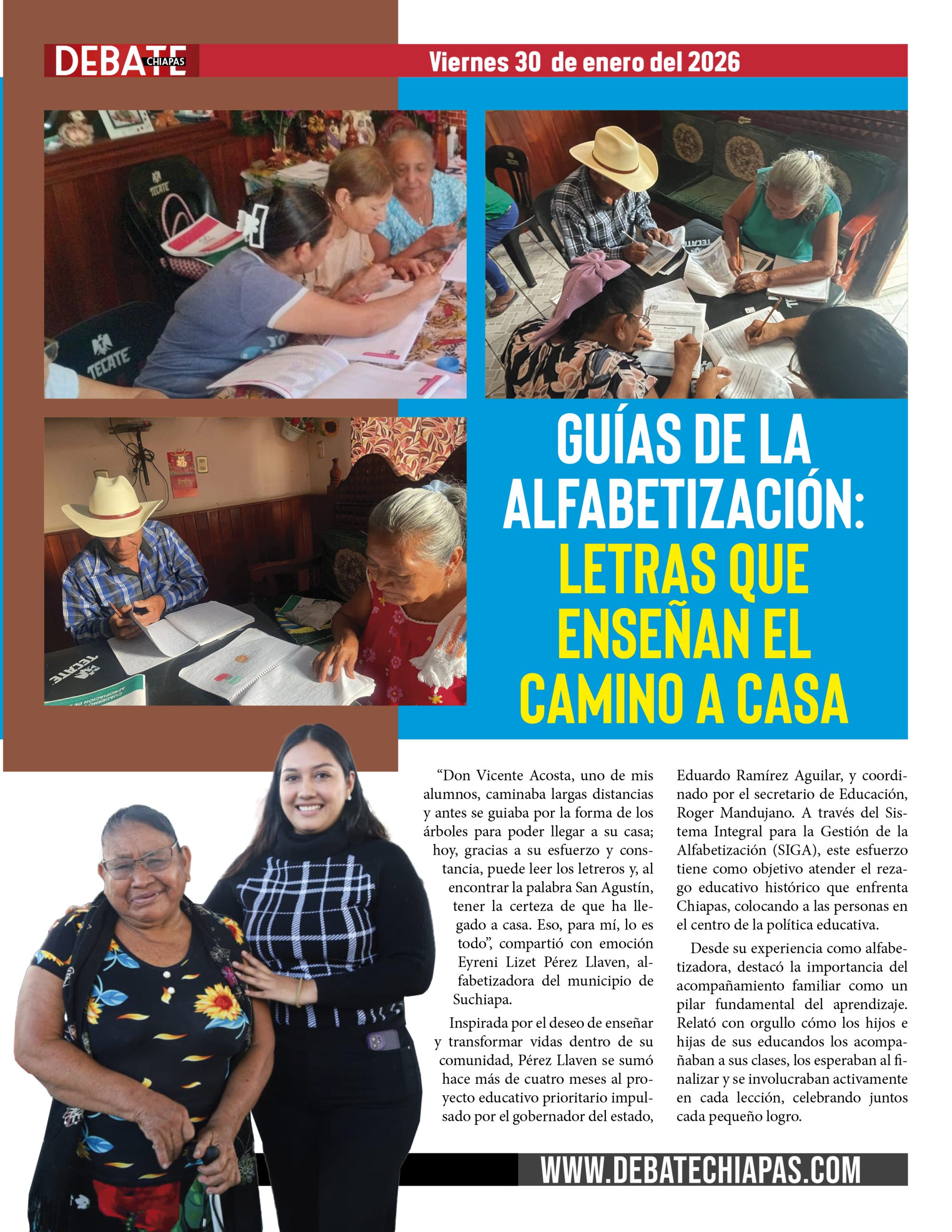 “Don Vicente Acosta, uno de mis alumnos, caminaba largas distancias y antes se guiaba por la forma de los árboles para poder llegar a su casa; hoy, gracias a su esfuerzo y constancia, puede leer los letreros y, al encontrar la palabra San Agustín, tener la certeza de que ha llegado a casa. Eso, para mí, lo es todo”, compartió con emoción Eyreni Lizet Pérez Llaven, alfabetizadora del municipio de Suchiapa.