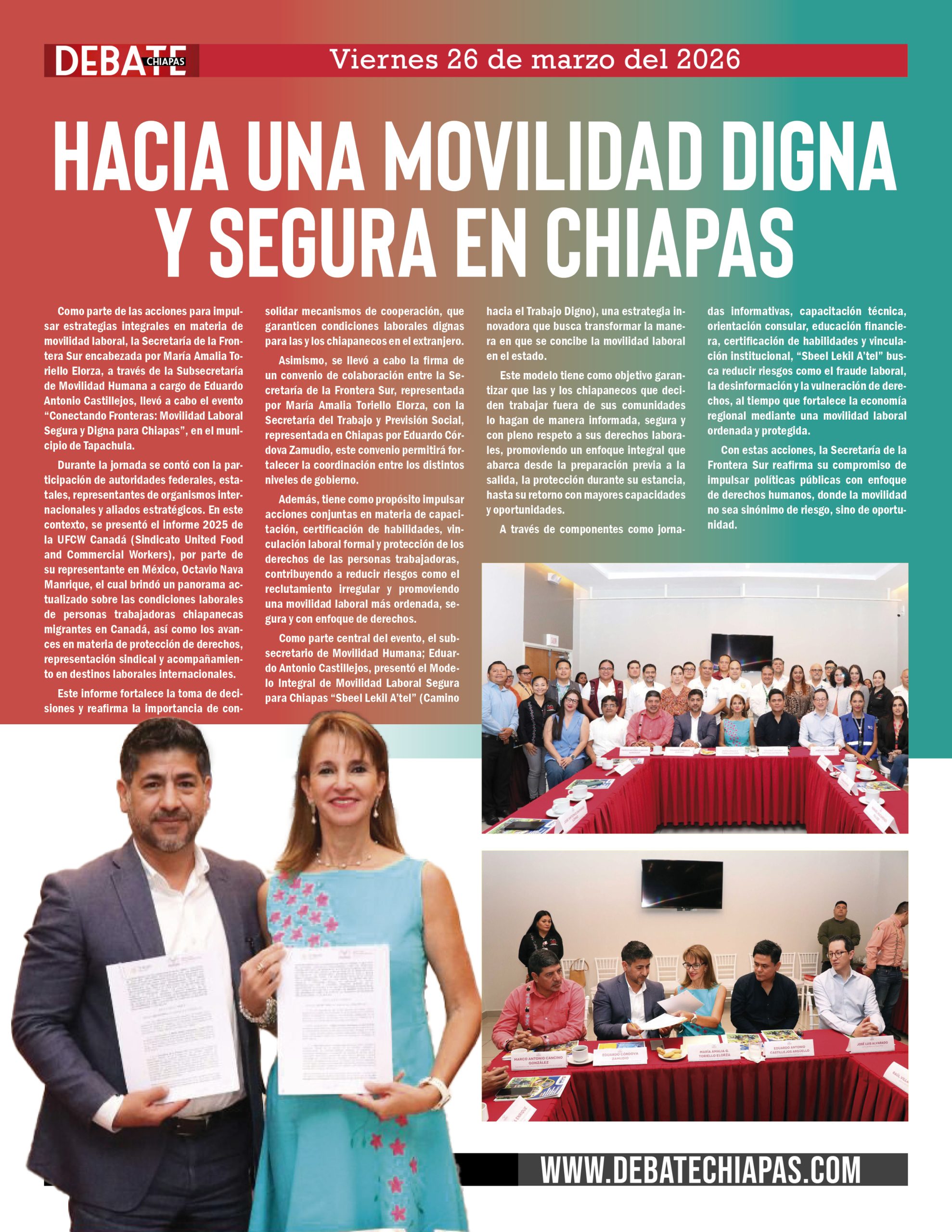 Como parte de las acciones para impulsar estrategias integrales en materia de movilidad laboral, la Secretaría de la Frontera Sur encabezada por María Amalia Toriello Elorza, a través de la Subsecretaría de Movilidad Humana a cargo de Eduardo Antonio Castillejos, llevó a cabo el evento “Conectando Fronteras: Movilidad Laboral Segura y Digna para Chiapas”, en el municipio de Tapachula.