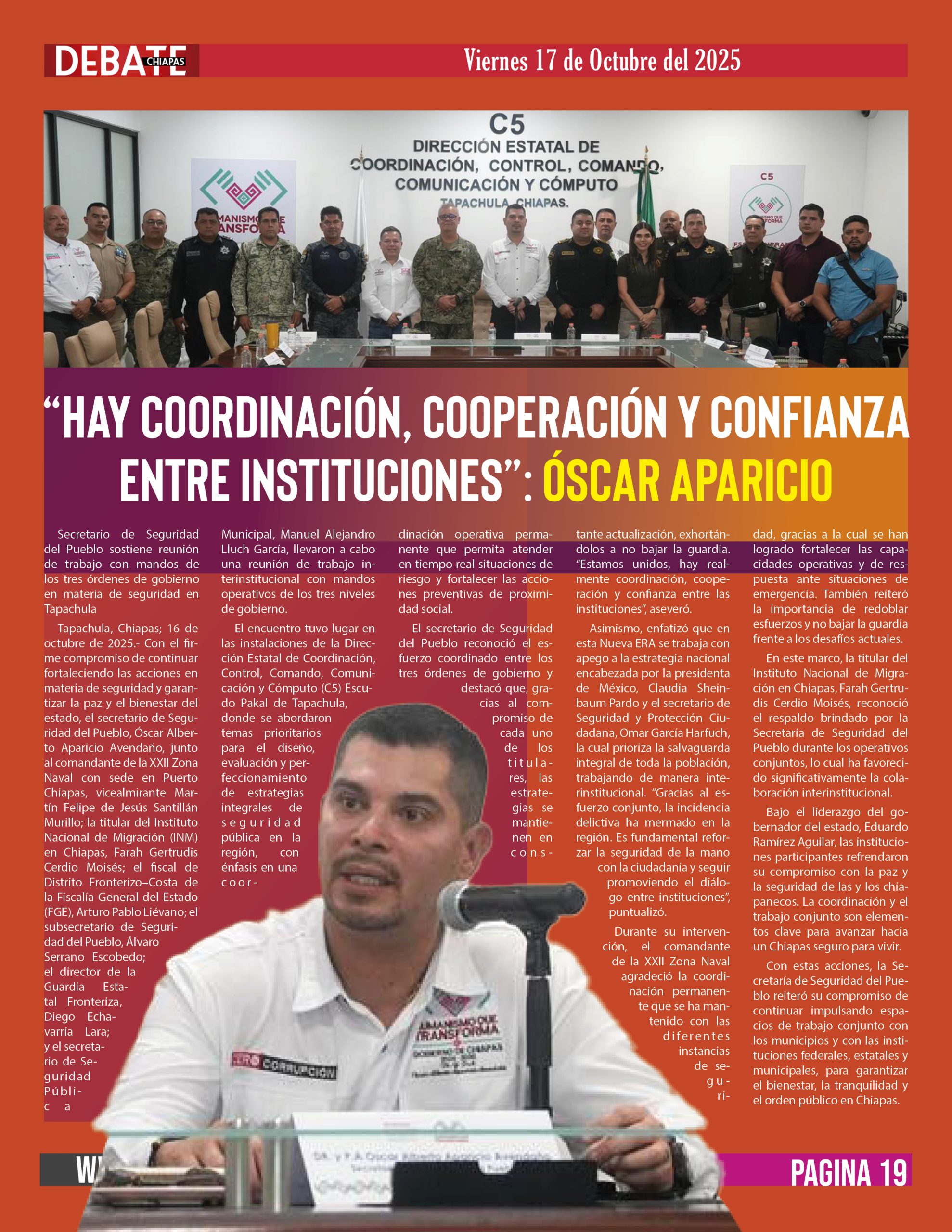 Tapachula, Chiapas; 16 de octubre de 2025.- Con el firme compromiso de continuar fortaleciendo las acciones en materia de seguridad y garantizar la paz y el bienestar del estado, el secretario de Seguridad del Pueblo, Óscar Alberto Aparicio Avendaño, junto al comandante de la XXII Zona Naval con sede en Puerto Chiapas, vicealmirante Martín Felipe de Jesús Santillán Murillo; la titular del Instituto Nacional de Migración (INM) en Chiapas, Farah Gertrudis Cerdio Moisés; el fiscal de Distrito Fronterizo – Costa de la Fiscalía General del Estado (FGE), Arturo Pablo Liévano; el subsecretario de Seguridad del Pueblo, Álvaro Serrano Escobedo; el director de la Guardia Estatal Fronteriza, Diego Echavarría Lara; y el secretario de Seguridad Pública Municipal, Manuel Alejandro Lluch García, llevaron a cabo una reunión de trabajo interinstitucional con mandos operativos de los tres niveles de gobierno.