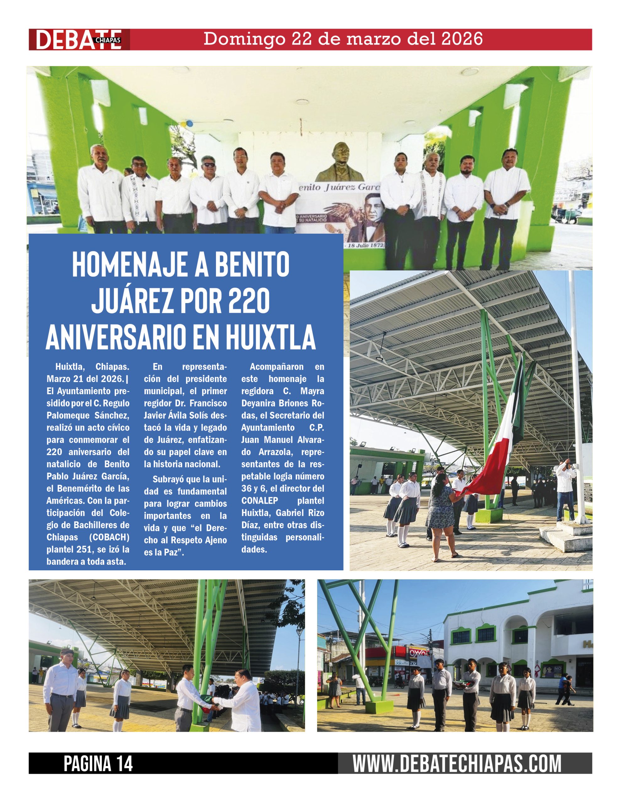 Huixtla, Chiapas. Marzo 21 del 2026.| El Ayuntamiento presidido por el C. Regulo Palomeque Sánchez, realizó un acto cívico para conmemorar el 220 aniversario del natalicio de Benito Pablo Juárez García, el Benemérito de las Américas. Con la participación del Colegio de Bachilleres de Chiapas (COBACH) plantel 251, se izó la bandera a toda asta.