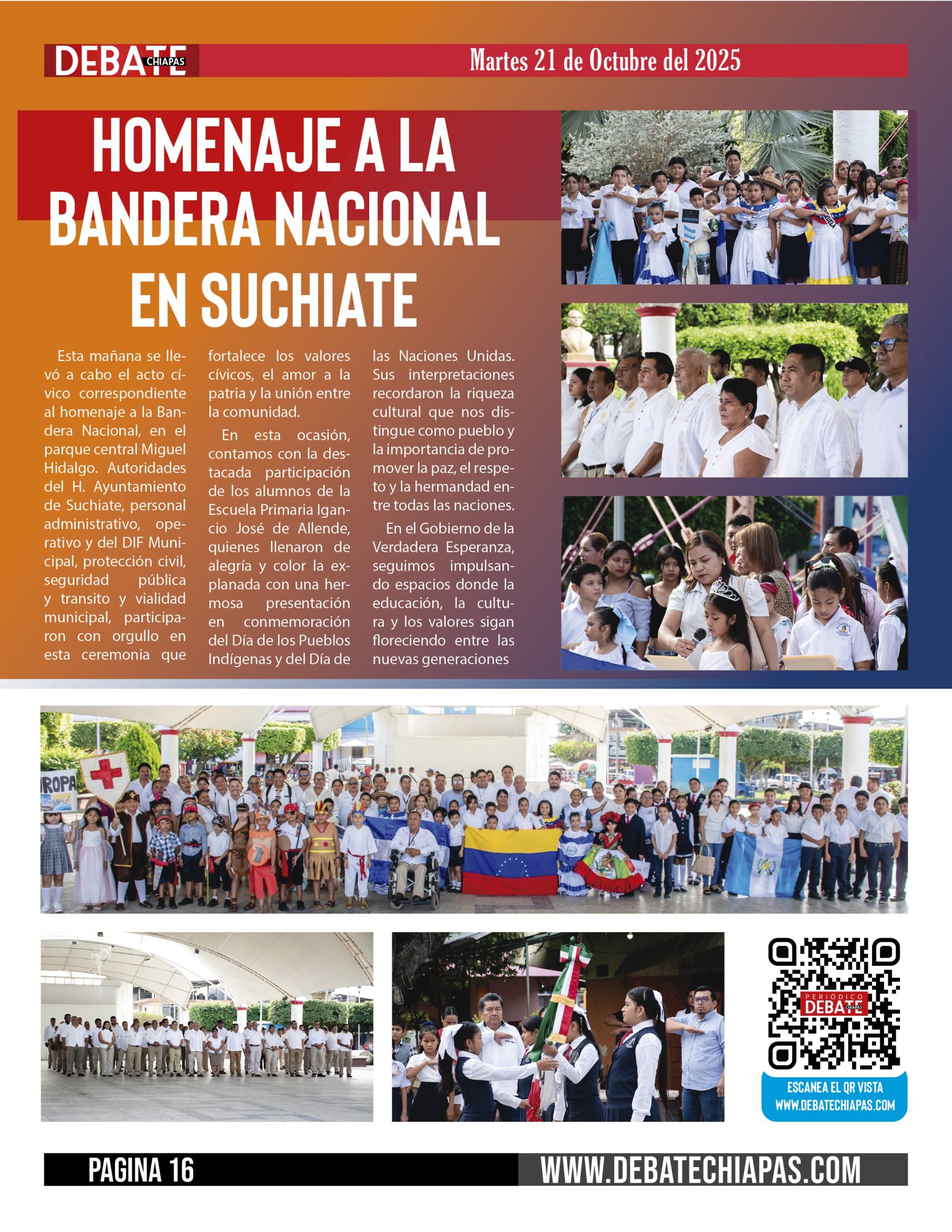 Esta mañana se llevó a cabo el acto cívico correspondiente al homenaje a la Bandera Nacional, en el parque central Miguel Hidalgo. Autoridades del H. Ayuntamiento de Suchiate, personal administrativo, operativo y del DIF Municipal, protección civil, seguridad pública y transito y vialidad municipal, participaron con orgullo en esta ceremonia que fortalece los valores cívicos, el amor a la patria y la unión entre la comunidad.