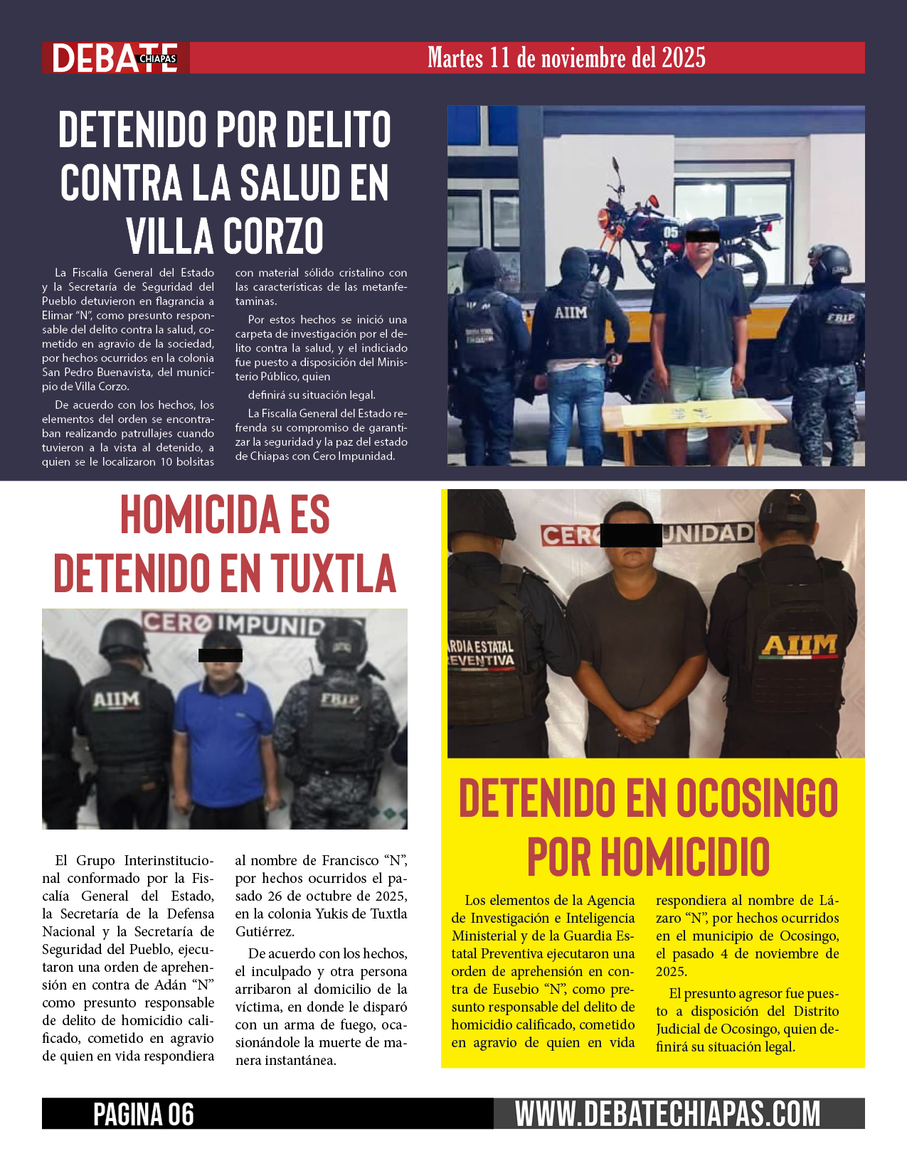El Grupo Interinstitucional conformado por la Fiscalía General del Estado, la Secretaría de la Defensa Nacional y la Secretaría de Seguridad del Pueblo, ejecutaron una orden de aprehensión en contra de Adán “N” como presunto responsable de delito de homicidio calificado, cometido en agravio de quien en vida respondiera al nombre de Francisco “N”, por hechos ocurridos el pasado 26 de octubre de 2025, en la colonia Yukis de Tuxtla Gutiérrez.