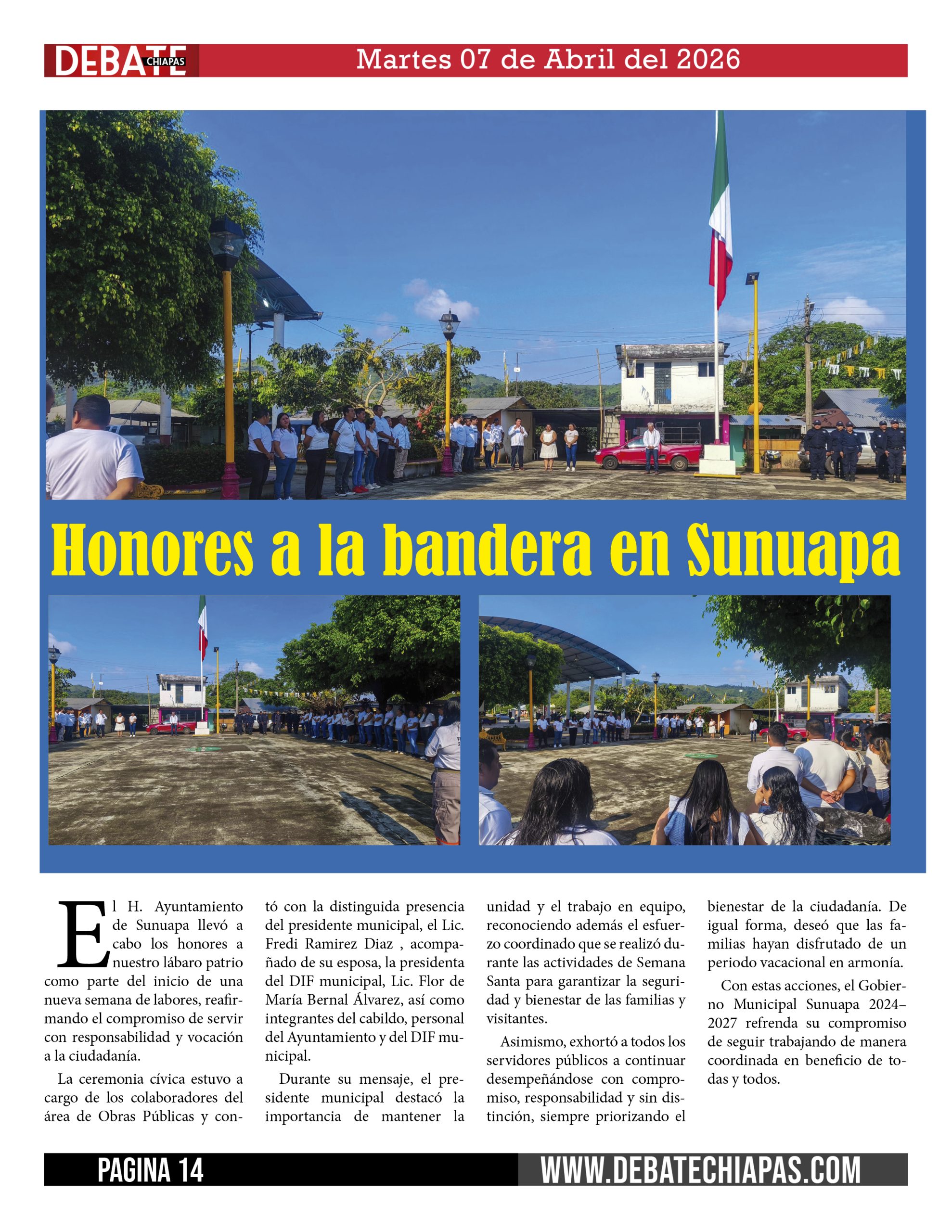 El H. Ayuntamiento de Sunuapa llevó a cabo los honores a nuestro lábaro patrio como parte del inicio de una nueva semana de labores, reafirmando el compromiso de servir con responsabilidad y vocación a la ciudadanía.