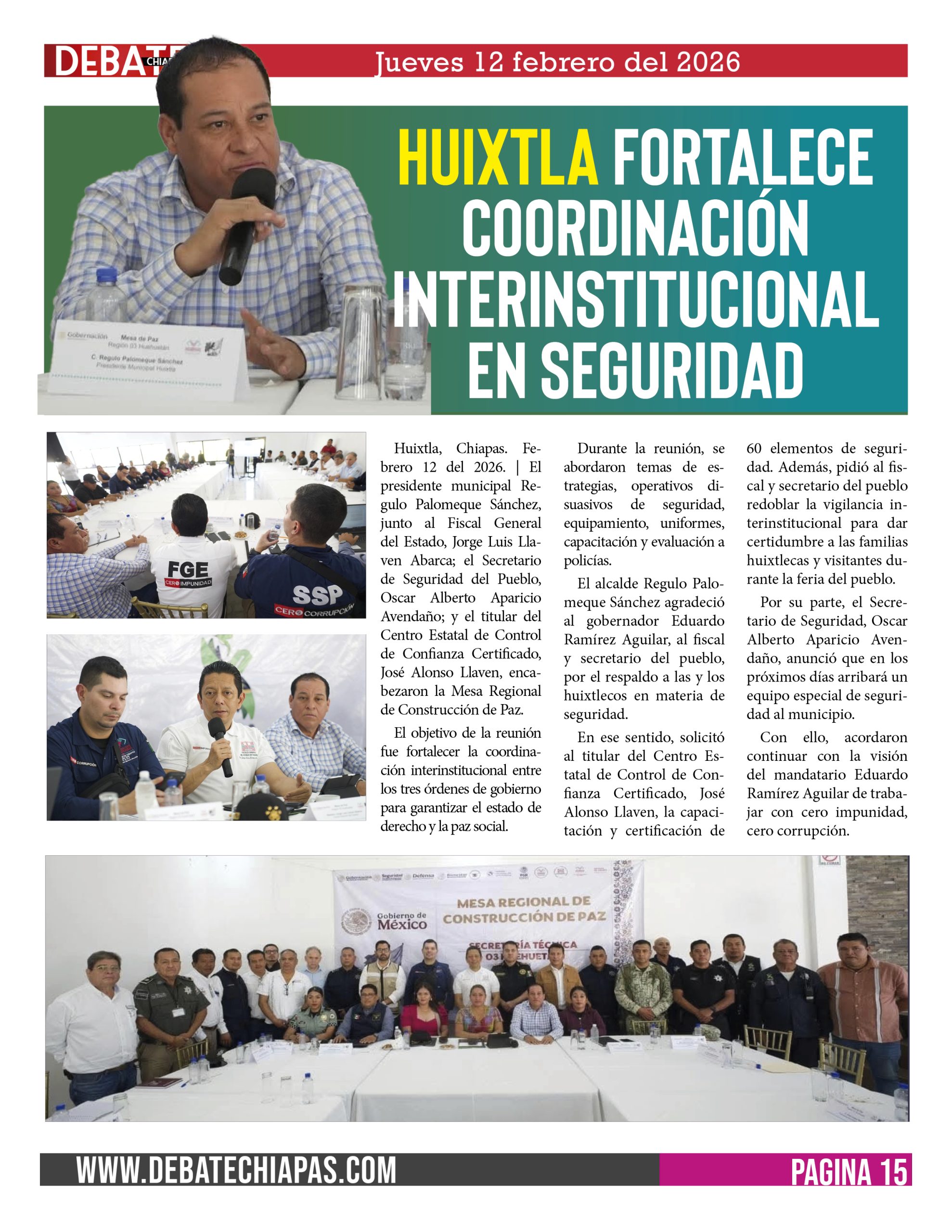 Huixtla, Chiapas. Febrero 12 del 2026. | El presidente municipal Regulo Palomeque Sánchez, junto al Fiscal General del Estado, Jorge Luis Llaven Abarca; el Secretario de Seguridad del Pueblo, Oscar Alberto Aparicio Avendaño; y el titular del Centro Estatal de Control de Confianza Certificado, José Alonso Llaven, encabezaron la Mesa Regional de Construcción de Paz.