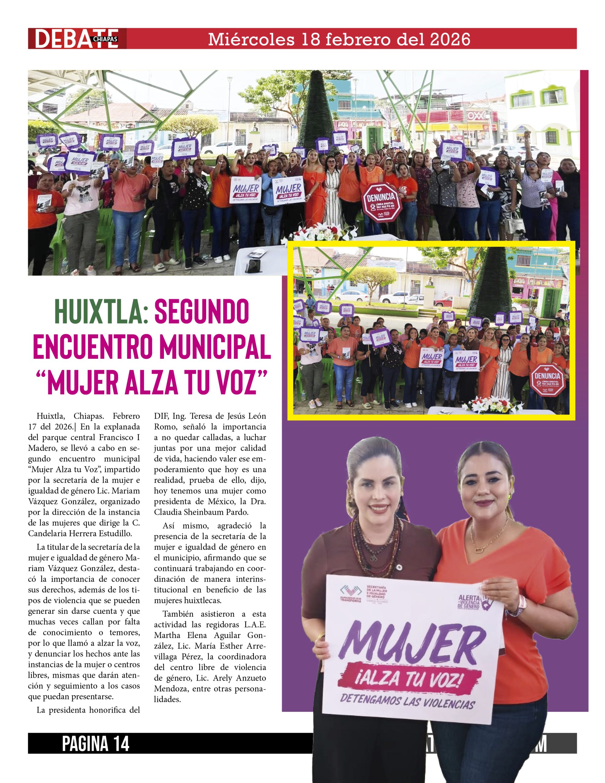 Huixtla, Chiapas. Febrero 17 del 2026.| En la explanada del parque central Francisco I Madero, se llevó a cabo en segundo encuentro municipal “Mujer Alza tu Voz”, impartido por la secretaría de la mujer e igualdad de género Lic. Mariam Vázquez González, organizado por la dirección de la instancia de las mujeres que dirige la C. Candelaria Herrera Estudillo.