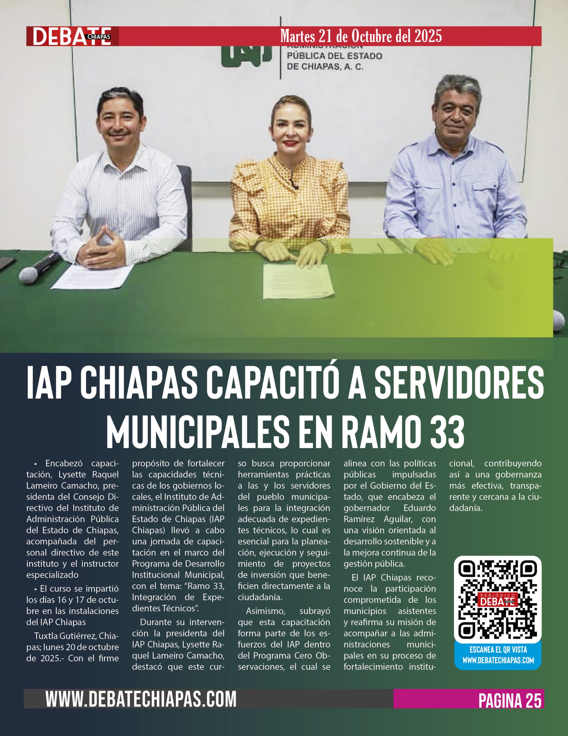 Tuxtla Gutiérrez, Chiapas; lunes 20 de octubre de 2025.- Con el firme propósito de fortalecer las capacidades técnicas de los gobiernos locales, el Instituto de Administración Pública del Estado de Chiapas (IAP Chiapas) llevó a cabo una jornada de capacitación en el marco del Programa de Desarrollo Institucional Municipal, con el tema: “Ramo 33, Integración de Expedientes Técnicos”.