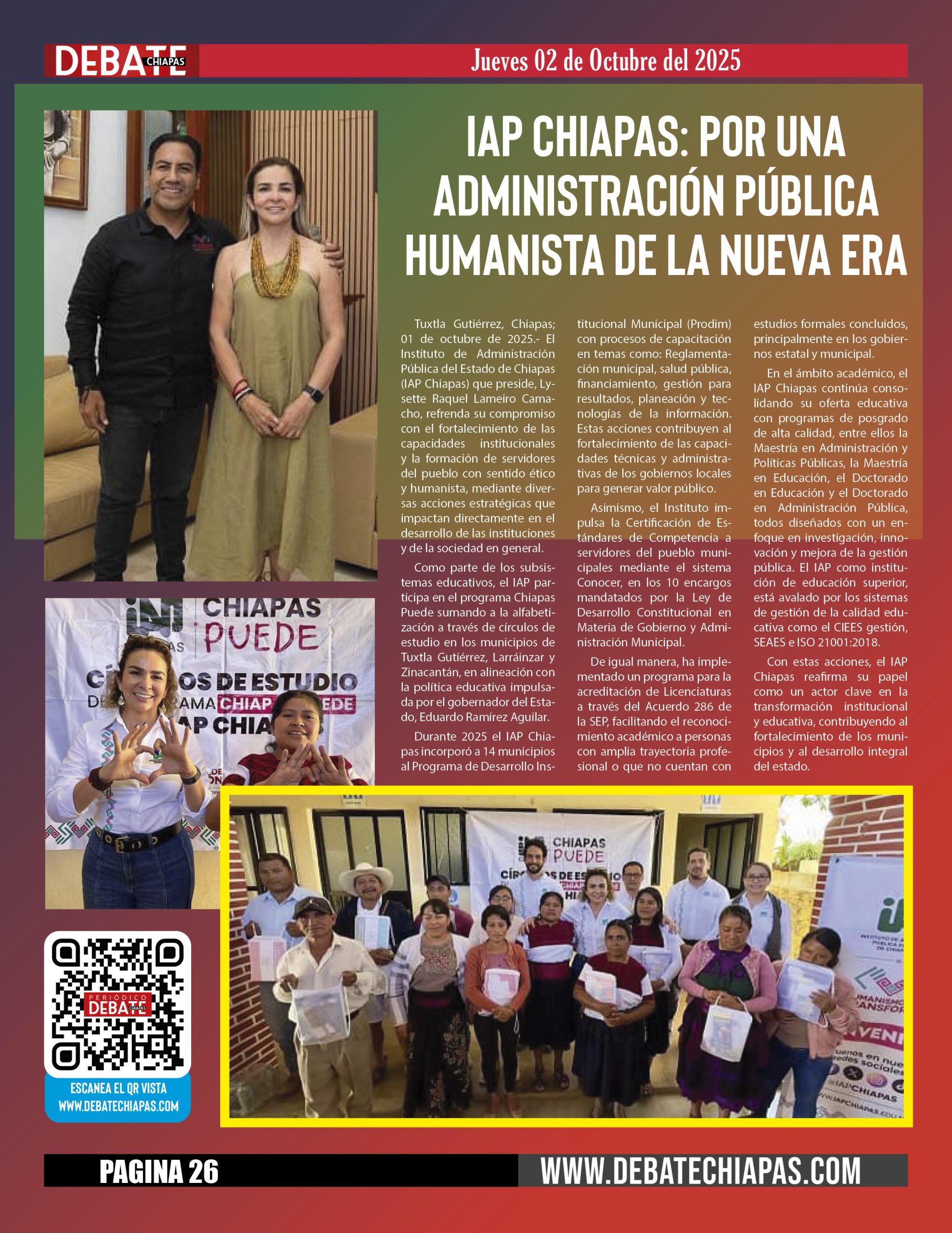 Tuxtla Gutiérrez, Chiapas; 01 de octubre de 2025.- El Instituto de Administración Pública del Estado de Chiapas (IAP Chiapas) que preside, Lysette Raquel Lameiro Camacho, refrenda su compromiso con el fortalecimiento de las capacidades institucionales y la formación de servidores del pueblo con sentido ético y humanista, mediante diversas acciones estratégicas que impactan directamente en el desarrollo de las instituciones y de la sociedad en general.