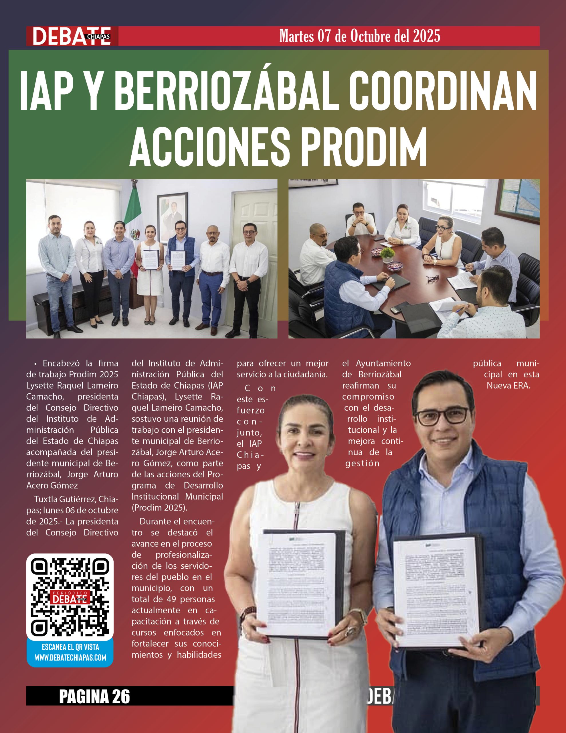 • Encabezó la firma de trabajo Prodim 2025 Lysette Raquel Lameiro Camacho, presidenta del Consejo Directivo del Instituto de Administración Pública del Estado de Chiapas acompañada del presidente municipal de Berriozábal, Jorge Arturo Acero Gómez