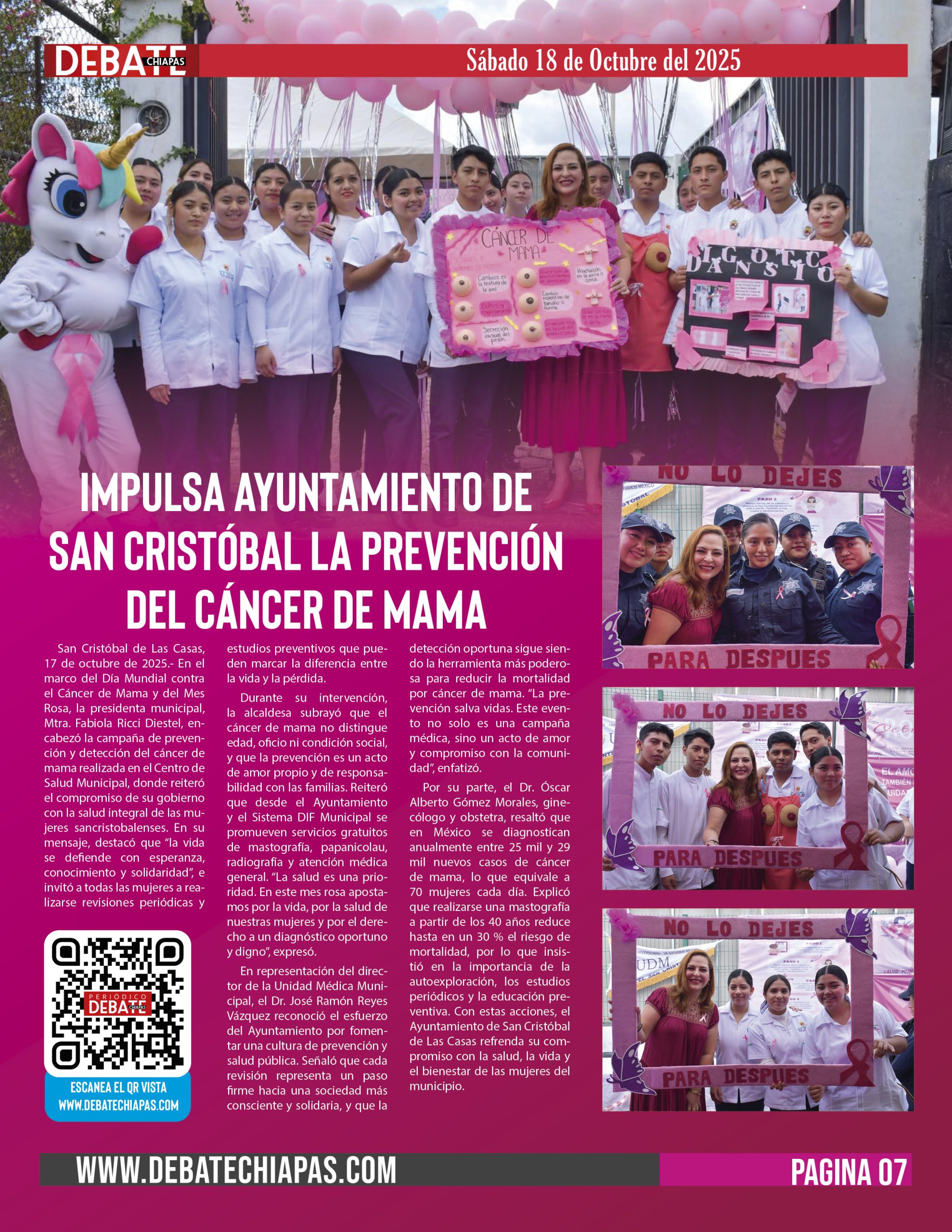 Por su parte, el Dr. Óscar Alberto Gómez Morales, ginecólogo y obstetra, resaltó que en México se diagnostican anualmente entre 25 mil y 29 mil nuevos casos de cáncer de mama, lo que equivale a 70 mujeres cada día. Explicó que realizarse una mastografía a partir de los 40 años reduce hasta en un 30 % el riesgo de mortalidad, por lo que insistió en la importancia de la autoexploración, los estudios periódicos y la educación preventiva. Con estas acciones, el Ayuntamiento de San Cristóbal de Las Casas refrenda su compromiso con la salud, la vida y el bienestar de las mujeres del municipio.
