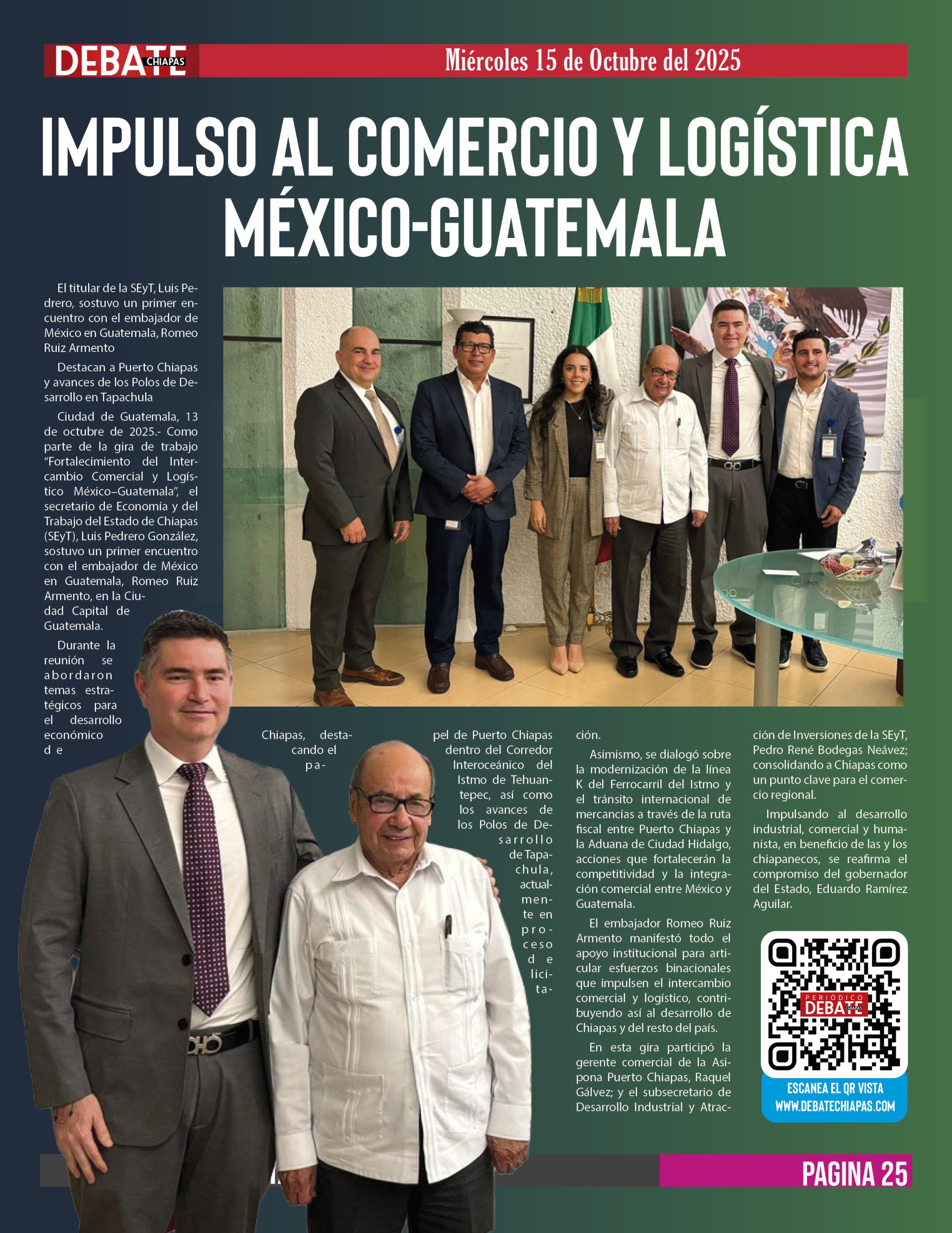 El embajador Romeo Ruiz Armento manifestó todo el apoyo institucional para articular esfuerzos binacionales que impulsen el intercambio comercial y logístico, contribuyendo así al desarrollo de Chiapas y del resto del país.