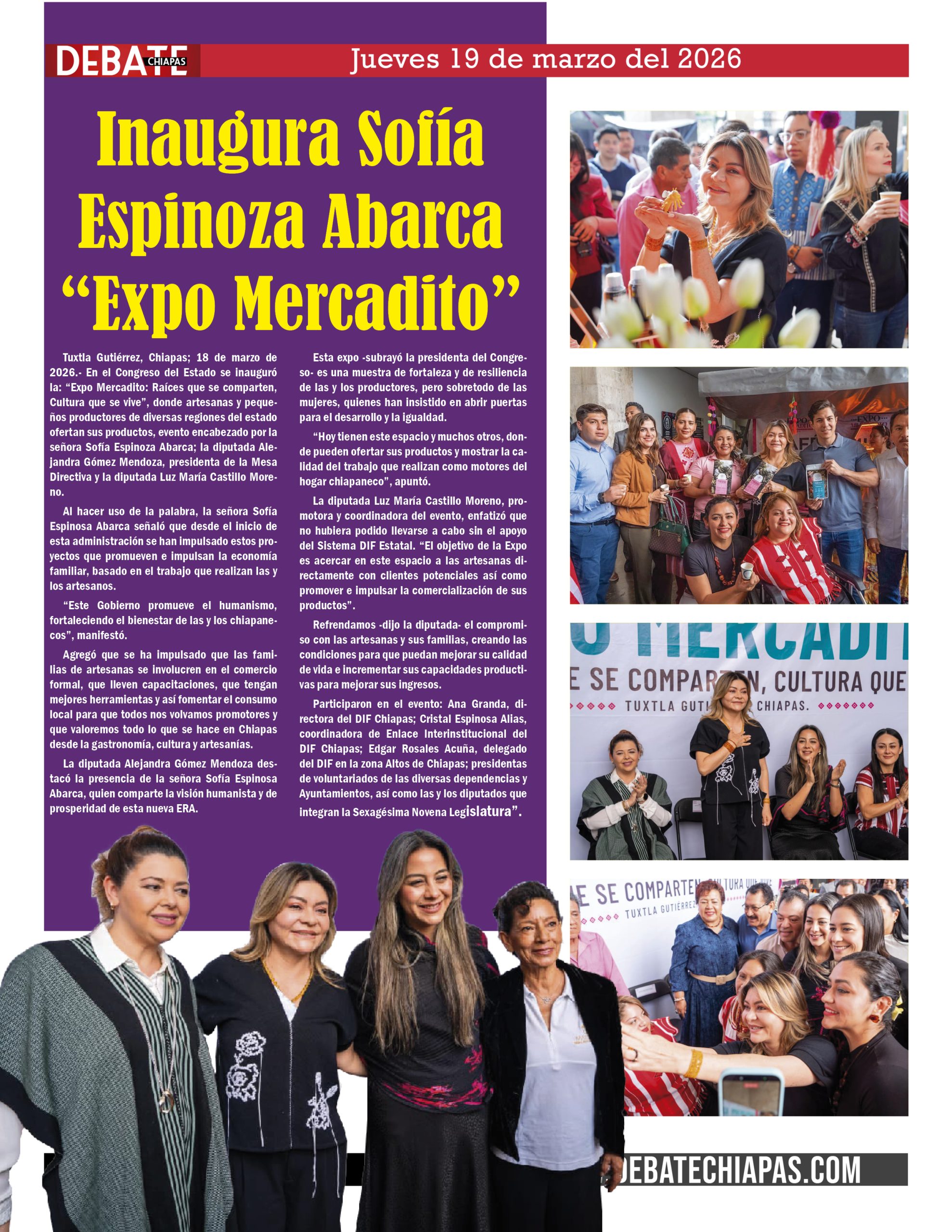 Tuxtla Gutiérrez, Chiapas; 18 de marzo de 2026.- En el Congreso del Estado se inauguró la: “Expo Mercadito: Raíces que se comparten, Cultura que se vive”, donde artesanas y pequeños productores de diversas regiones del estado ofertan sus productos, evento encabezado por la señora Sofía Espinoza Abarca; la diputada Alejandra Gómez Mendoza, presidenta de la Mesa Directiva y la diputada Luz María Castillo Moreno.