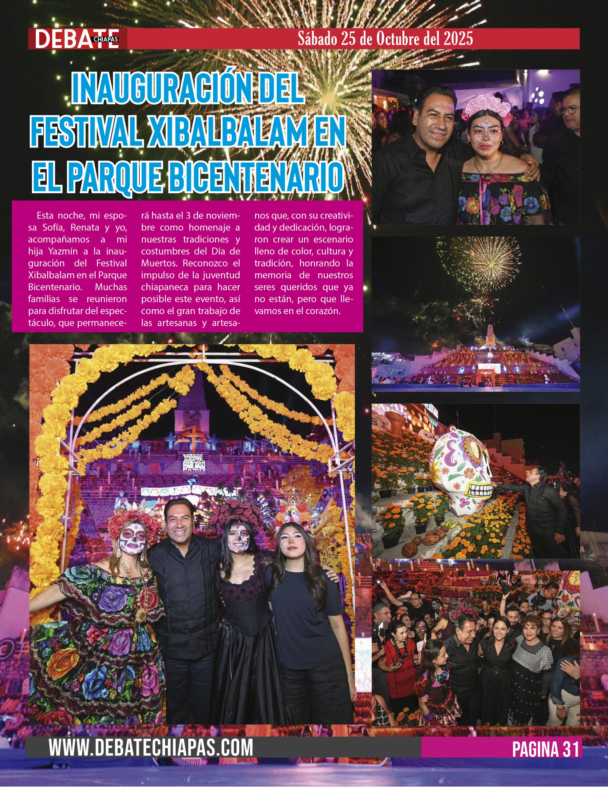 Esta noche, mi esposa Sofía, Renata y yo, acompañamos a mi hija Yazmín a la inauguración del Festival Xibalbalam en el Parque Bicentenario. Muchas familias se reunieron para disfrutar del espectáculo, que permanecerá hasta el 3 de noviembre como homenaje a nuestras tradiciones y costumbres del Día de Muertos. Reconozco el impulso de la juventud chiapaneca para hacer posible este evento, así como el gran trabajo de las artesanas y artesanos que, con su creatividad y dedicación, lograron crear un escenario lleno de color, cultura y tradición, honrando la memoria de nuestros seres queridos que ya no están, pero que llevamos en el corazón.
