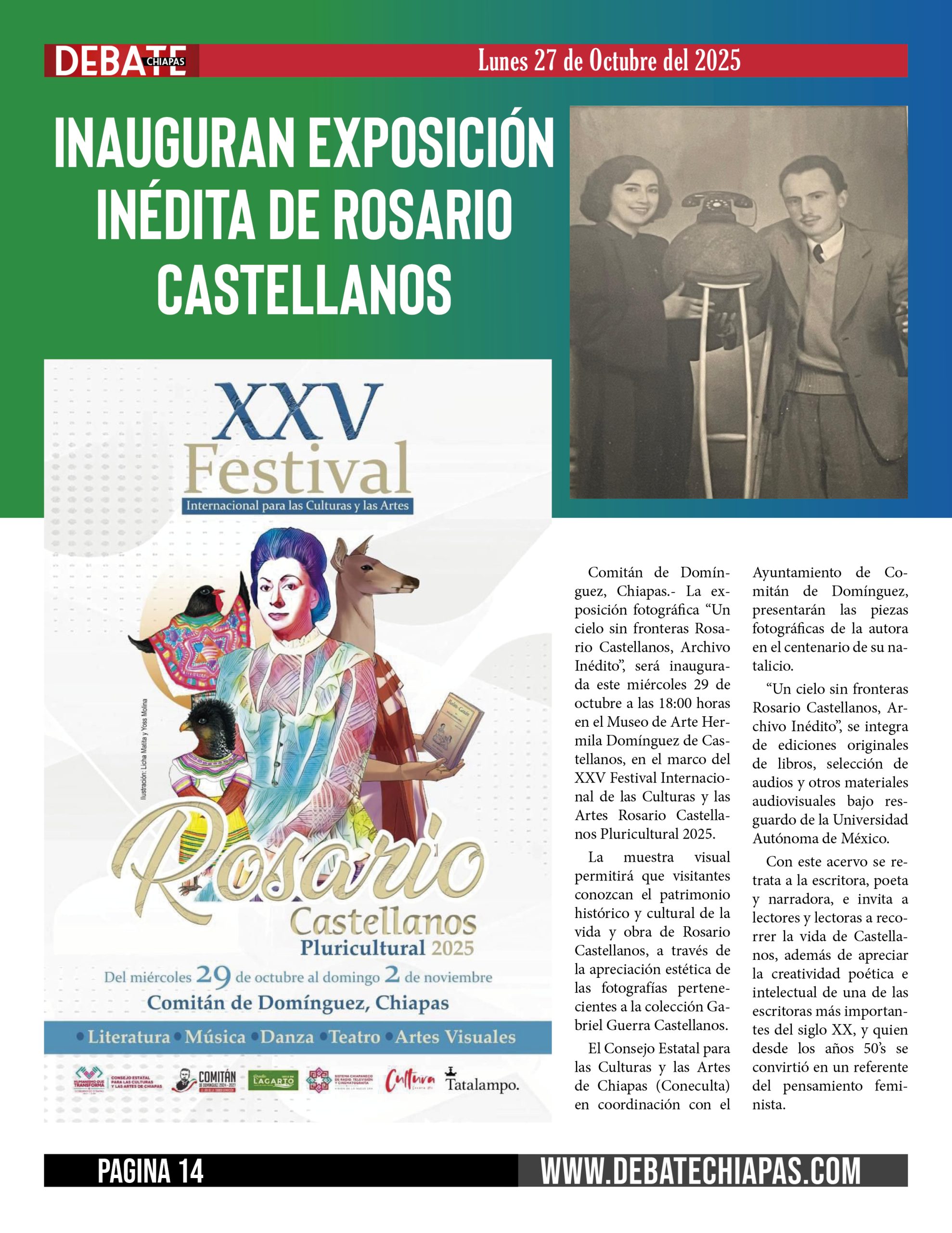 Comitán de Domínguez, Chiapas.- La exposición fotográfica “Un cielo sin fronteras Rosario Castellanos, Archivo Inédito”, será inaugurada este miércoles 29 de octubre a las 18:00 horas en el Museo de Arte Hermila Domínguez de Castellanos, en el marco del XXV Festival Internacional de las Culturas y las Artes Rosario Castellanos Pluricultural 2025.