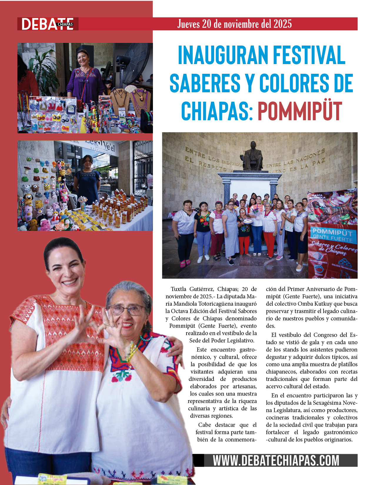 Tuxtla Gutiérrez, Chiapas; 20 de noviembre de 2025.- La diputada María Mandiola Totoricagüena inauguró la Octava Edición del Festival Sabores y Colores de Chiapas denominado Pommipüt (Gente Fuerte), evento realizado en el vestíbulo de la Sede del Poder Legislativo.