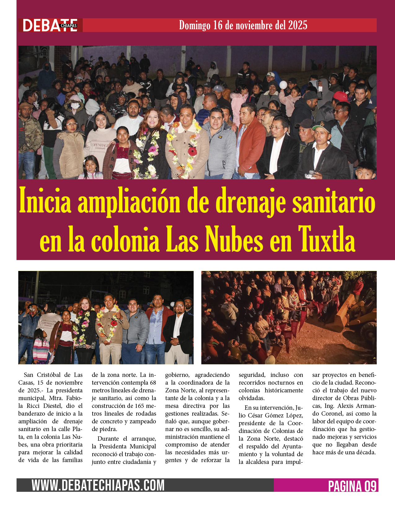 San Cristóbal de Las Casas, 15 de noviembre de 2025.- La presidenta municipal, Mtra. Fabiola Ricci Diestel, dio el banderazo de inicio a la ampliación de drenaje sanitario en la calle Plata, en la colonia Las Nubes, una obra prioritaria para mejorar la calidad de vida de las familias de la zona norte. La intervención contempla 68 metros lineales de drenaje sanitario, así como la construcción de 165 metros lineales de rodadas de concreto y zampeado de piedra.