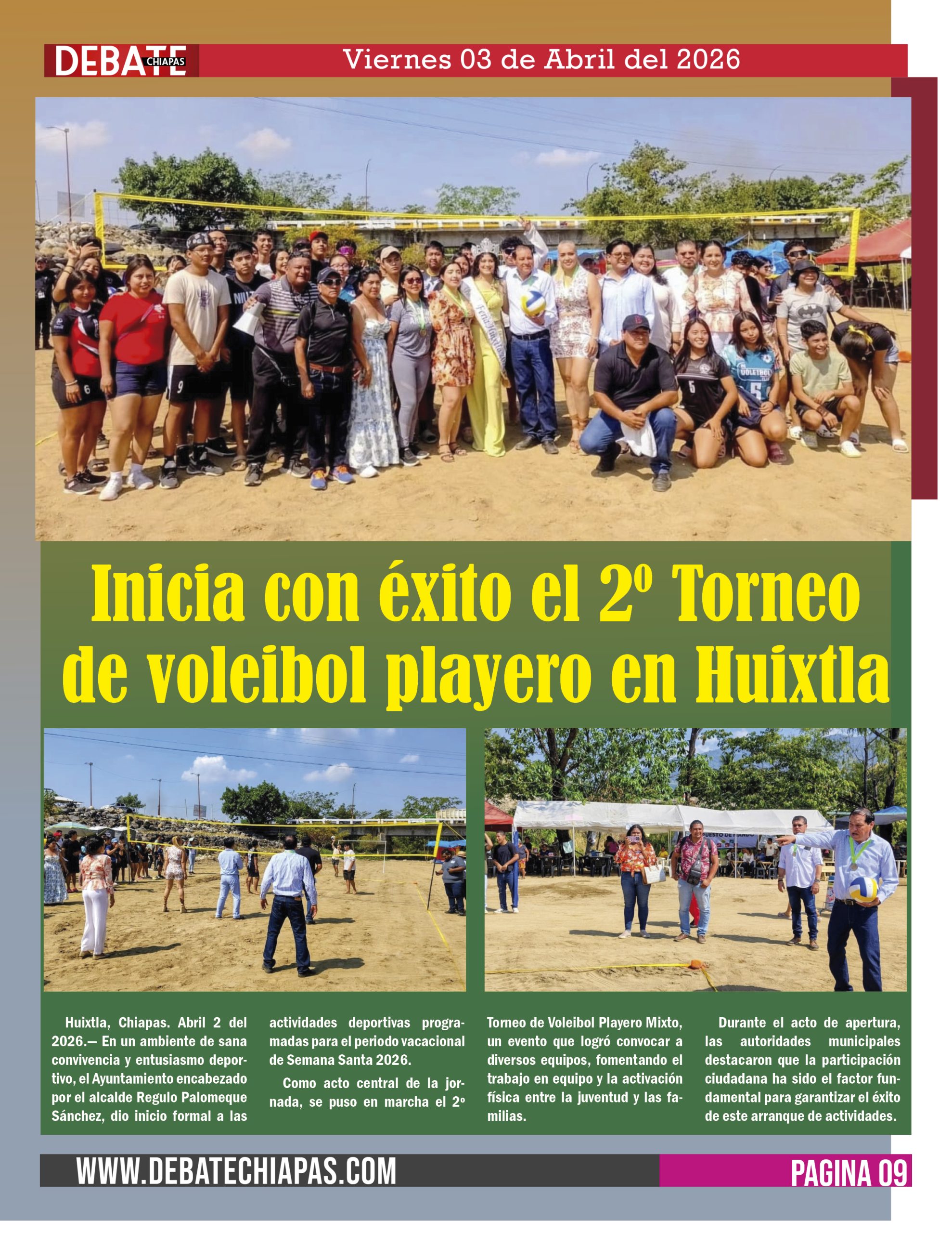 Huixtla, Chiapas. Abril 2 del 2026.— En un ambiente de sana convivencia y entusiasmo deportivo, el Ayuntamiento encabezado por el alcalde Regulo Palomeque Sánchez, dio inicio formal a las actividades deportivas programadas para el periodo vacacional de Semana Santa 2026.