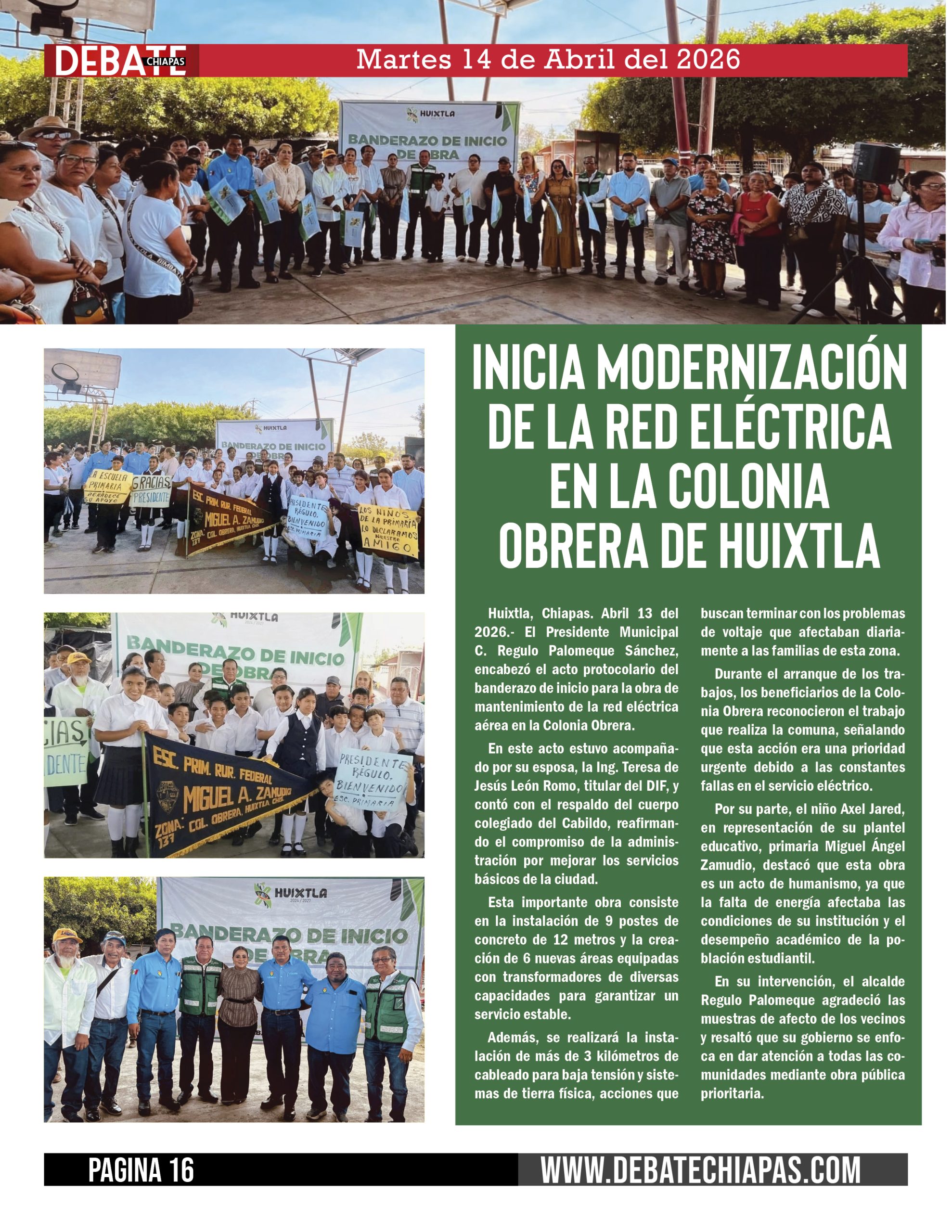 Huixtla, Chiapas. Abril 13 del 2026.- El Presidente Municipal C. Regulo Palomeque Sánchez, encabezó el acto protocolario del banderazo de inicio para la obra de mantenimiento de la red eléctrica aérea en la Colonia Obrera.