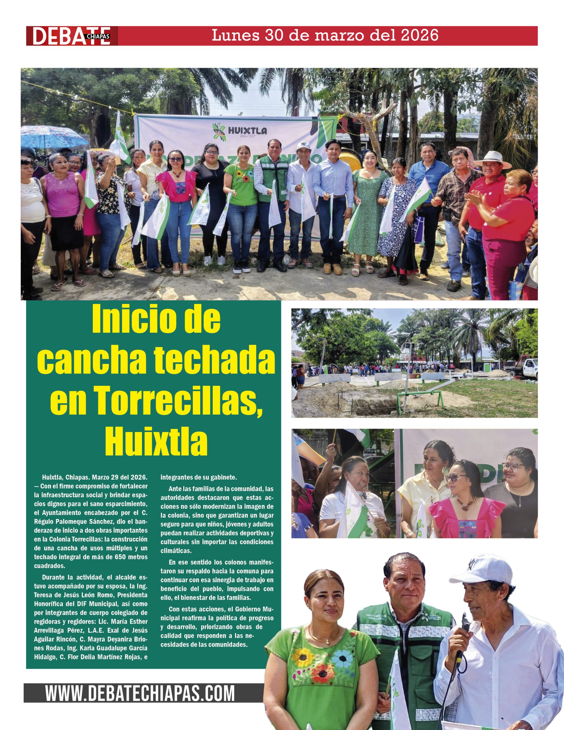 Huixtla, Chiapas. Marzo 29 del 2026. — Con el firme compromiso de fortalecer la infraestructura social y brindar espacios dignos para el sano esparcimiento, el Ayuntamiento encabezado por el C. Régulo Palomeque Sánchez, dio el banderazo de inicio a dos obras importantes en la Colonia Torrecillas: la construcción de una cancha de usos múltiples y un techado integral de más de 650 metros cuadrados.